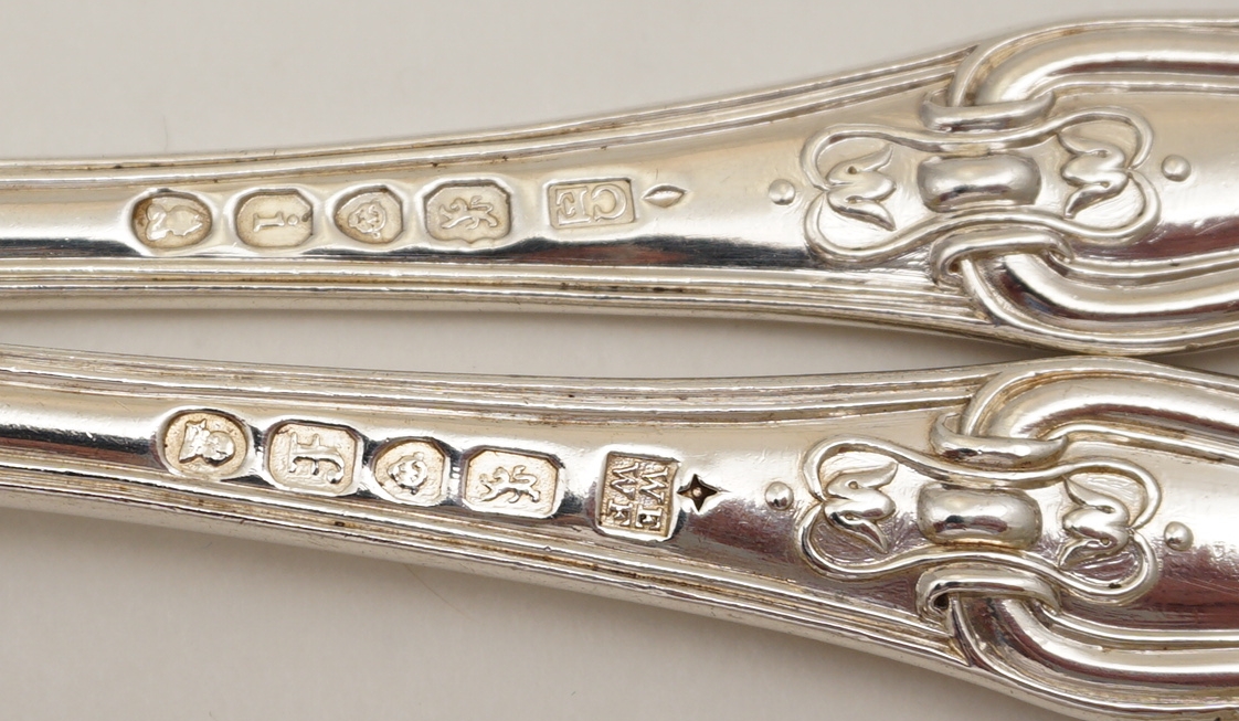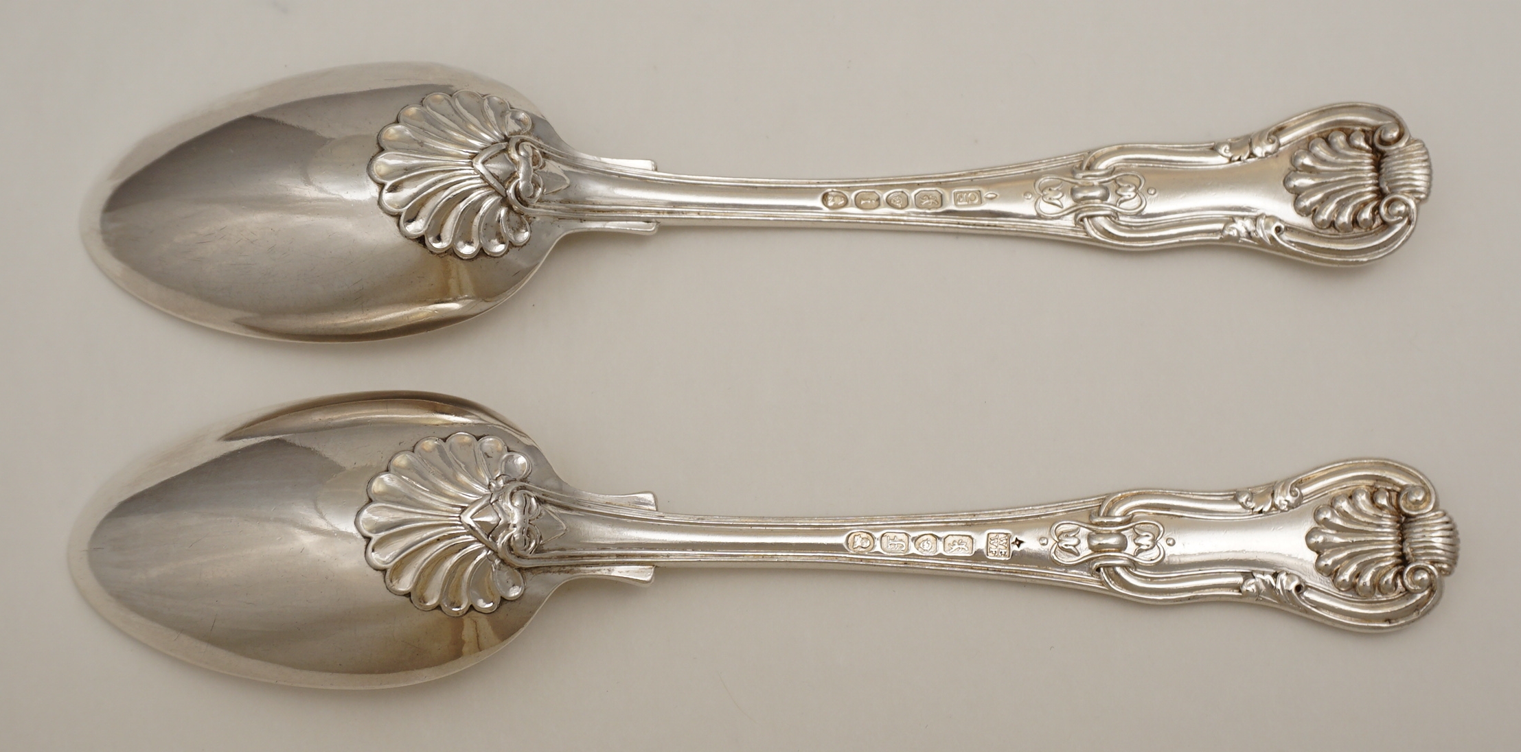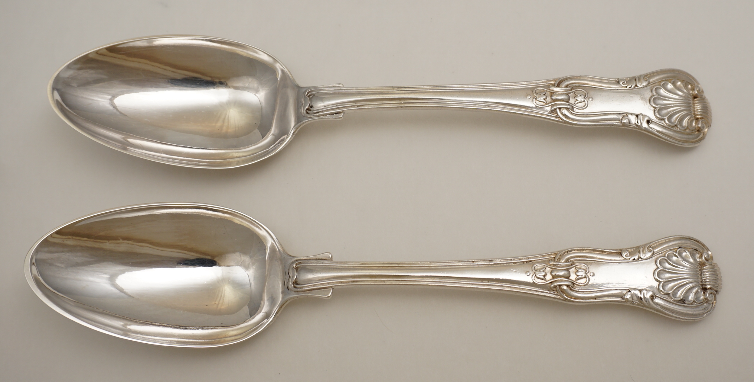 DESCRIPTION | Two very good antique English Georgian solid sterling silver double struck (pattern both sides) King's Hourglass with diamond shell heel pattern dessert spoons with no engraving or erasure. |