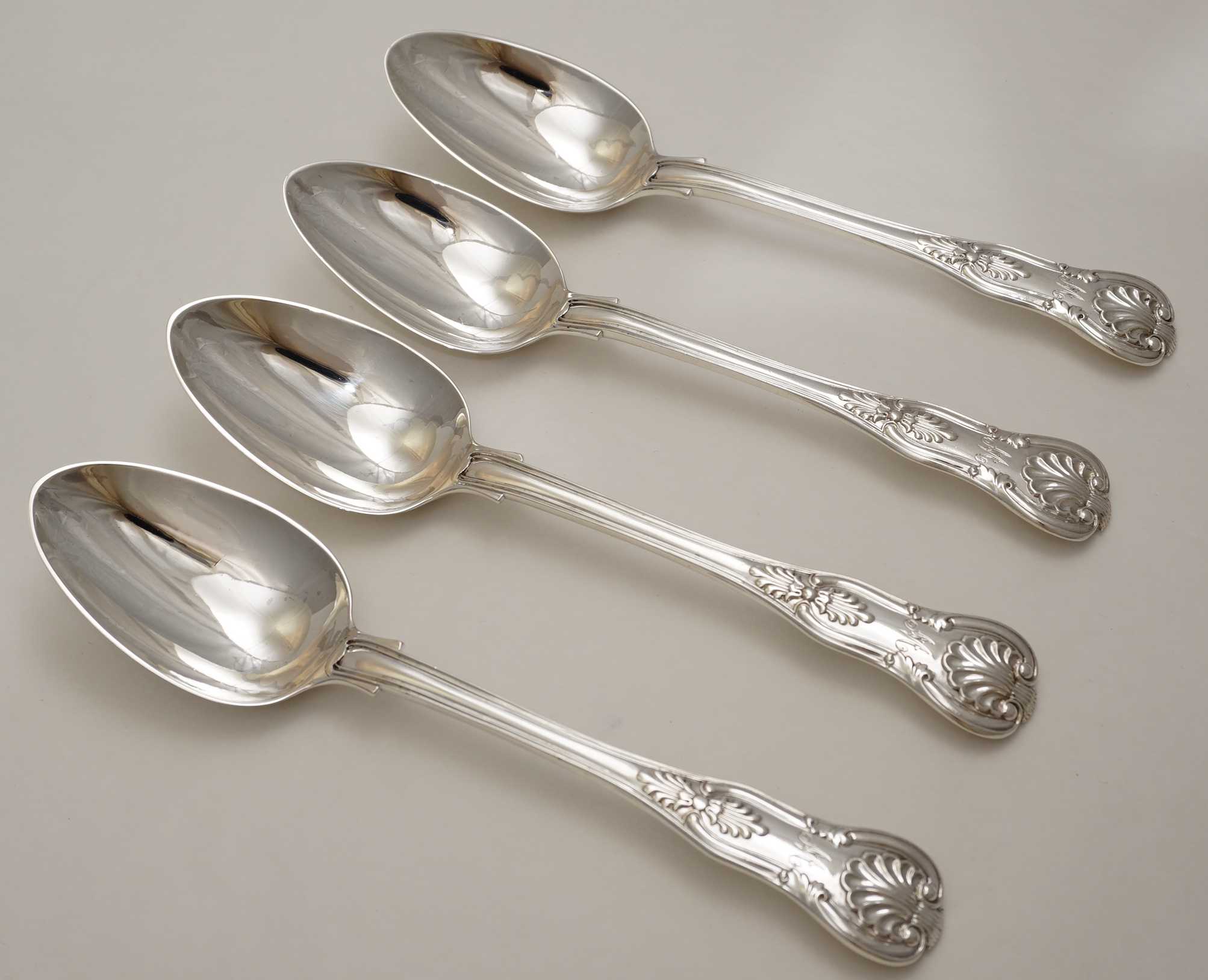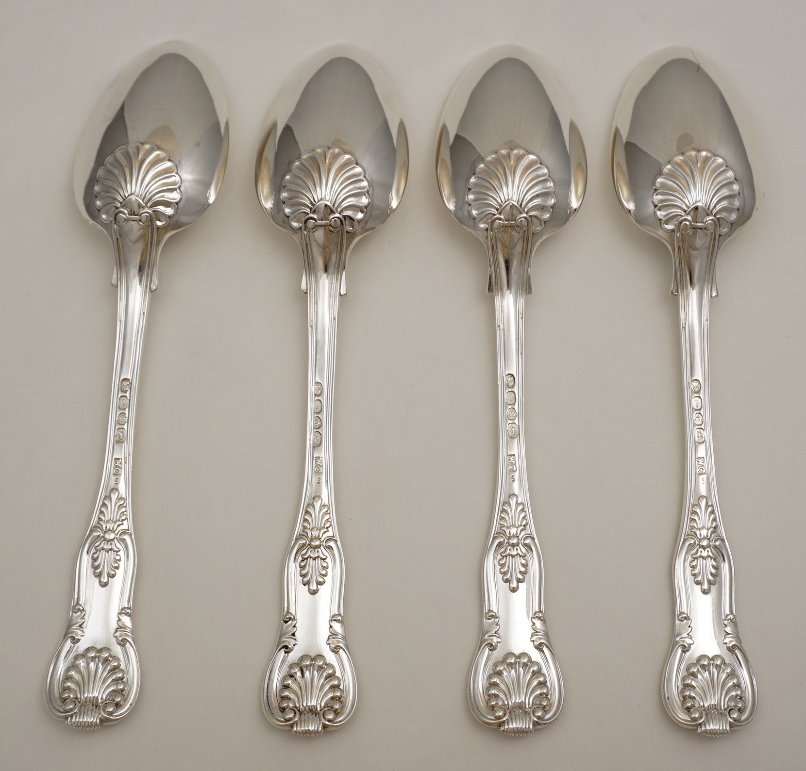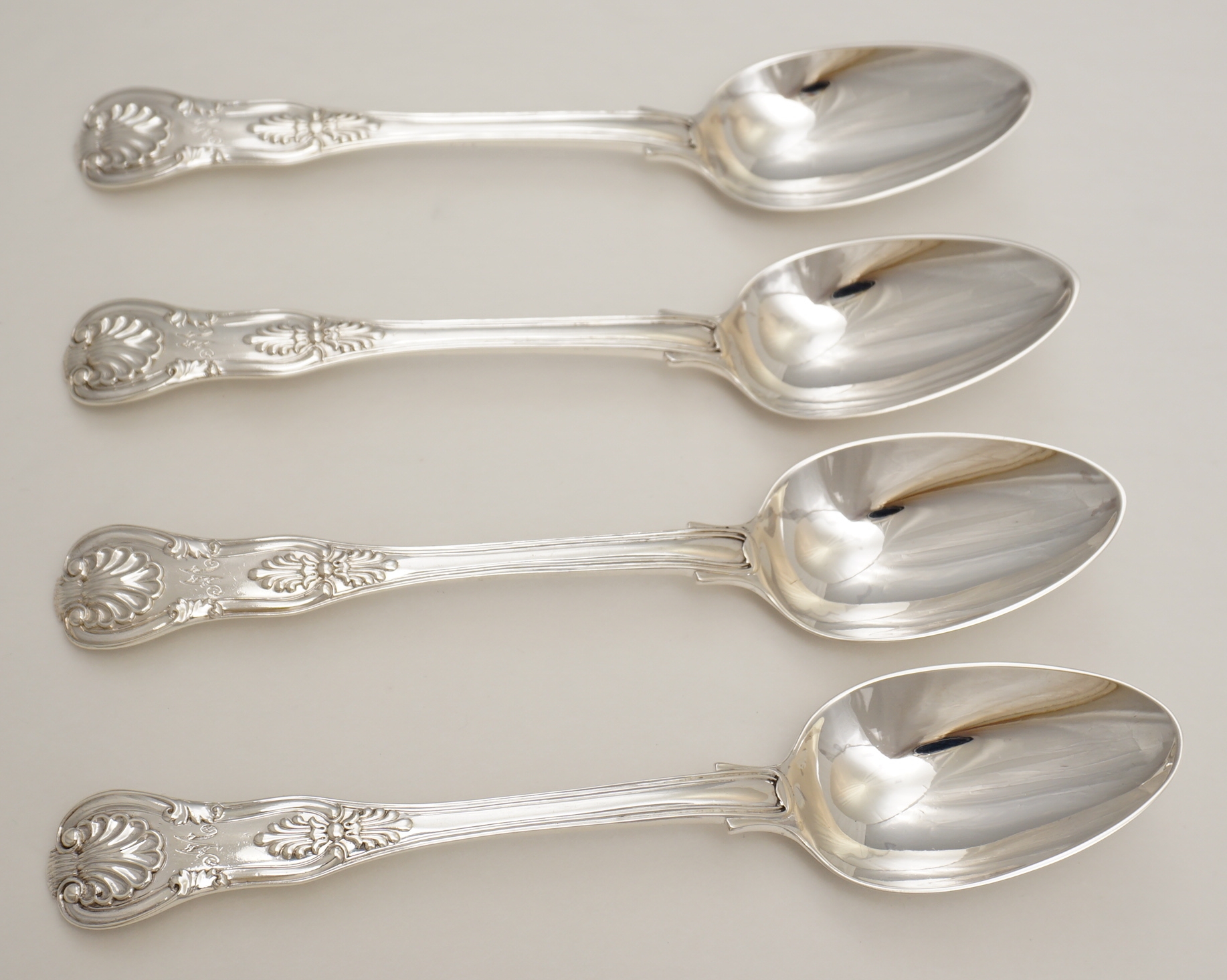 DESCRIPTION | Set of four excellent antique English Georgian solid sterling silver double struck (pattern both sides) King's pattern dessert spoons with a frontal initial engraving. |
