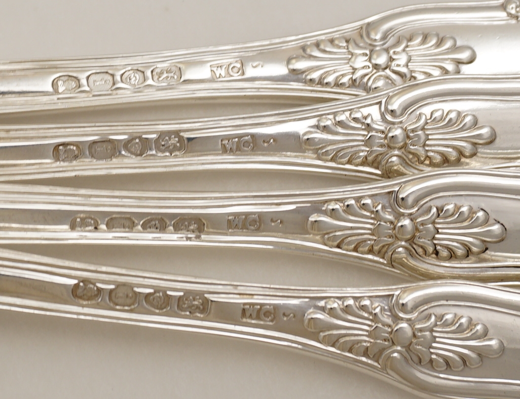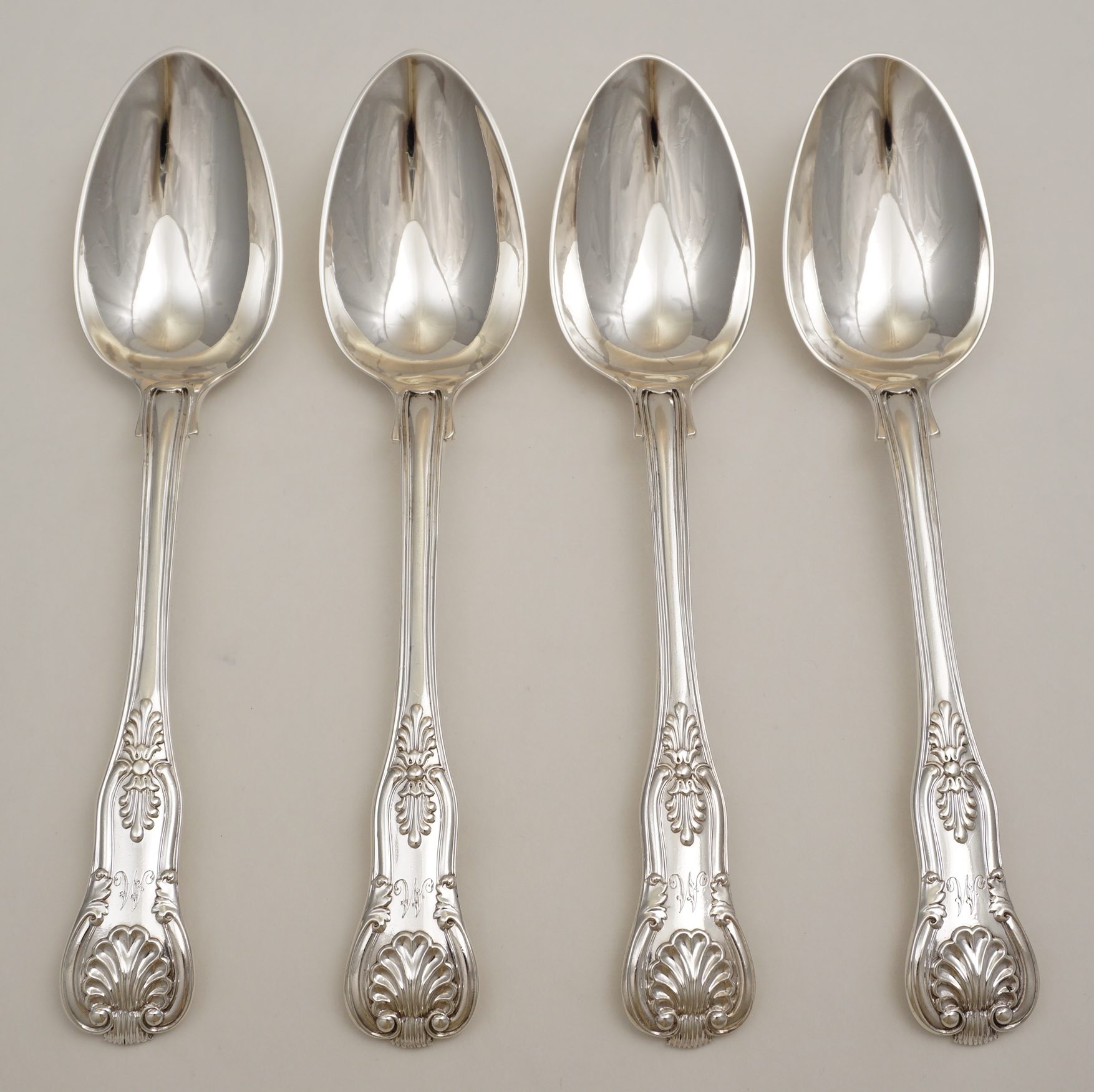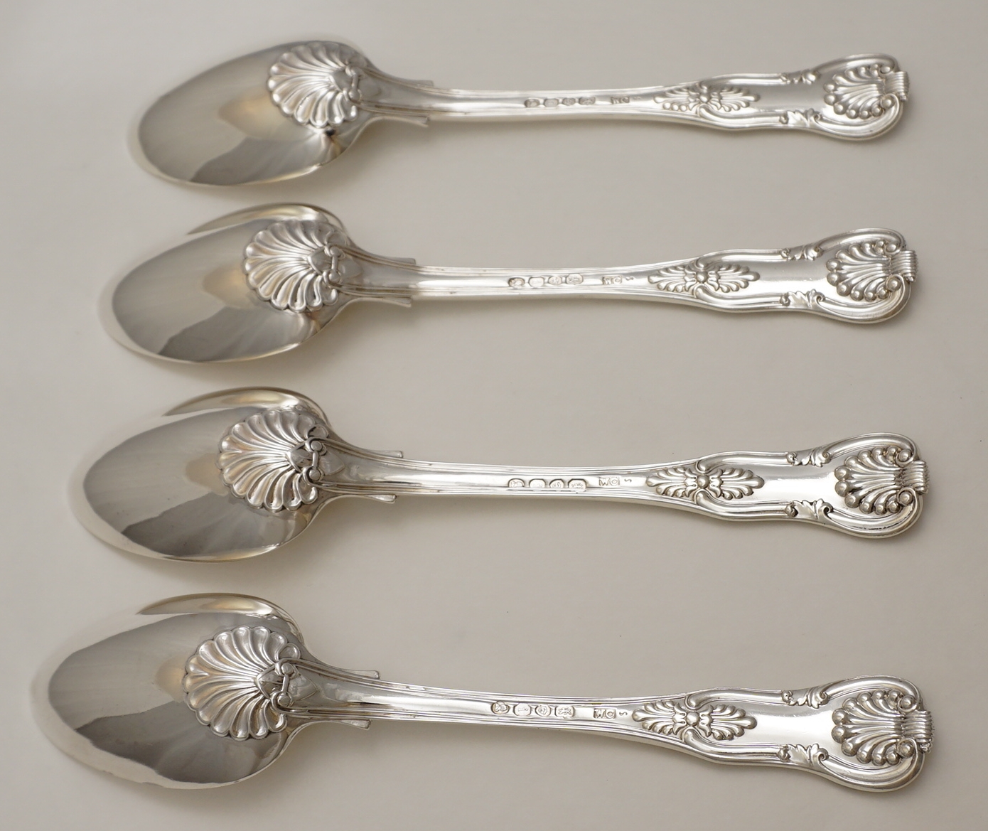 DESCRIPTION | Set of four excellent antique English Georgian solid sterling silver double struck (pattern both sides) King's pattern dessert spoons with a frontal initial engraving. |
