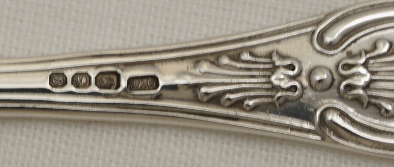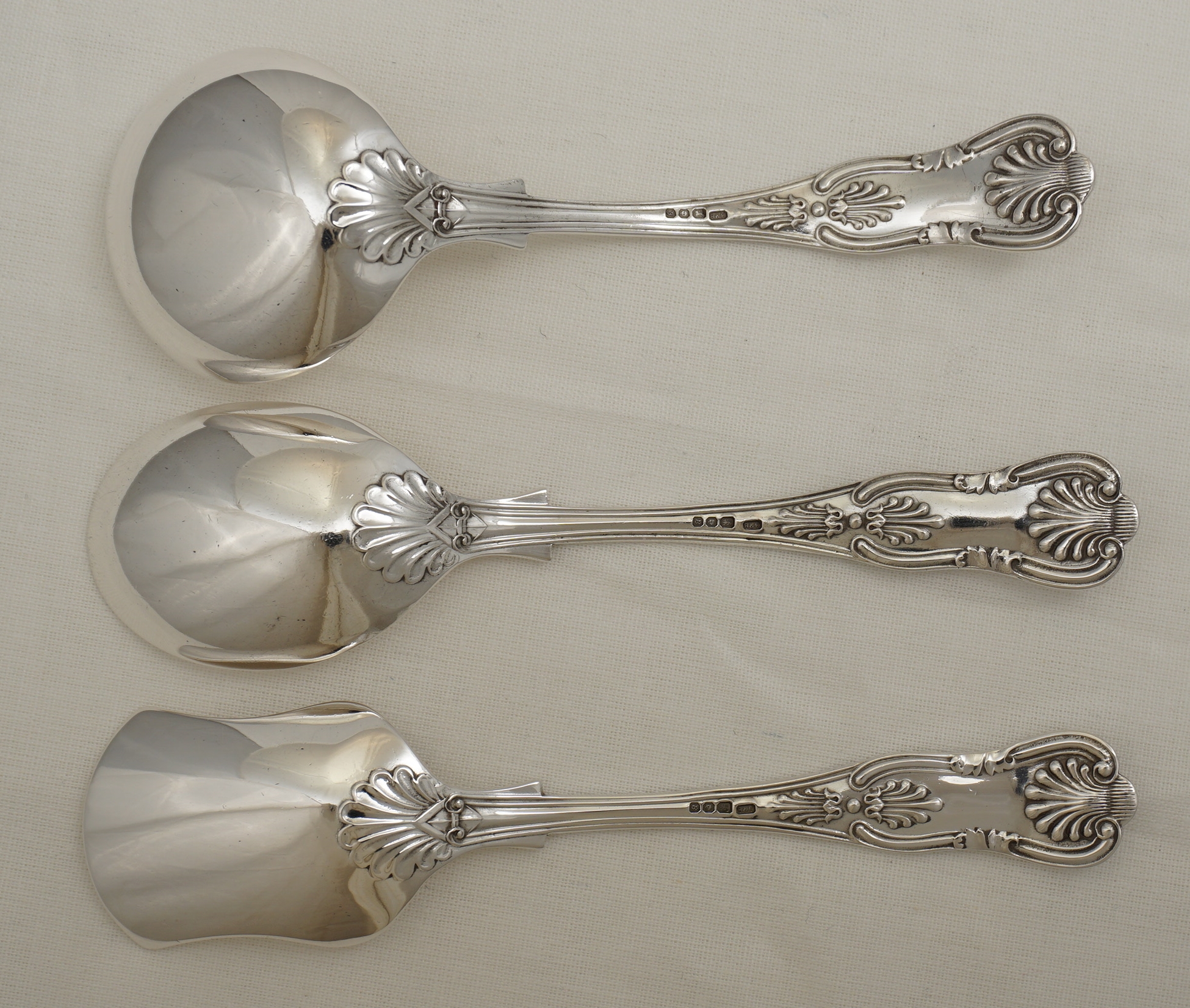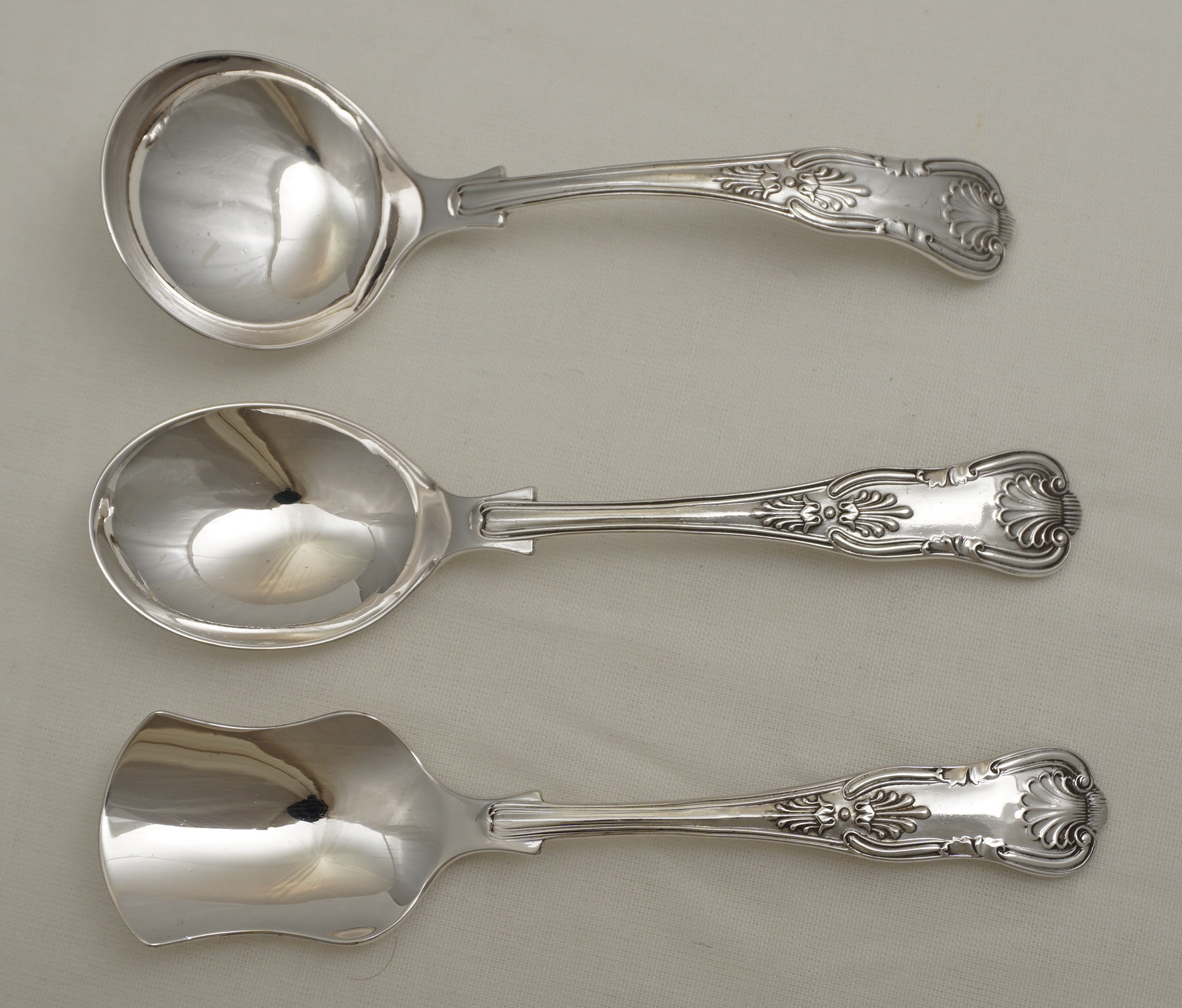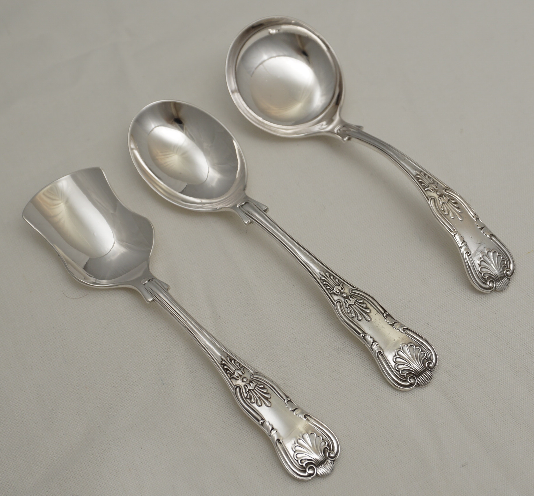 DESCRIPTION | Trio of little vintage English solid sterling silver double struck (pattern both sides) King's pattern serving pieces comprising of cream ladle, sugar shovel and jam spoon. |