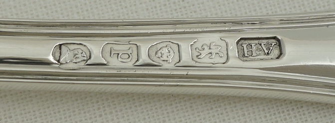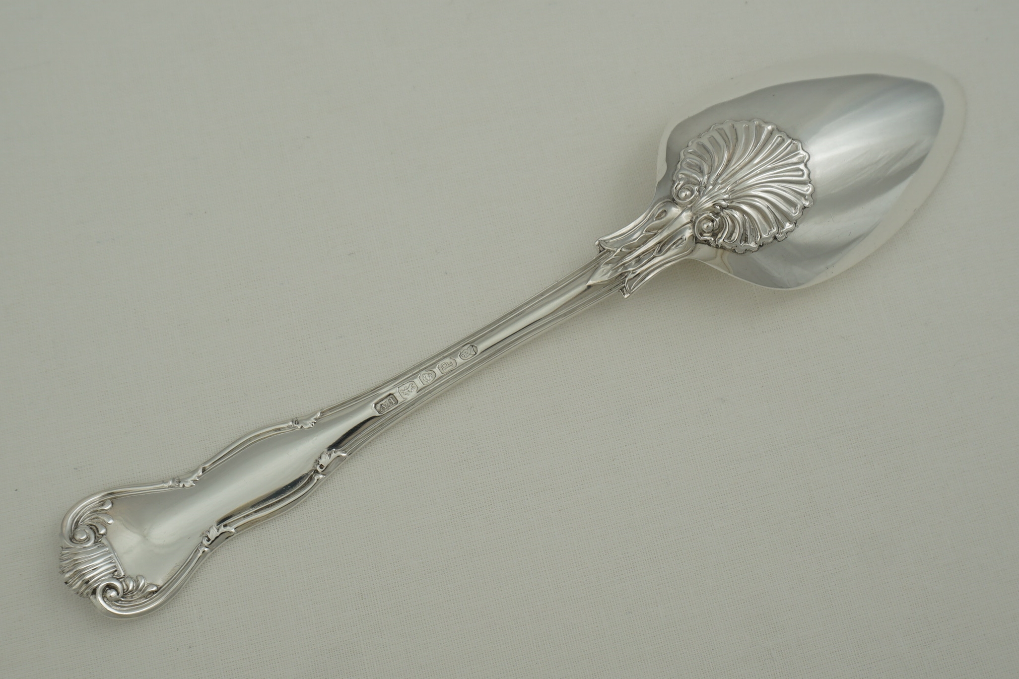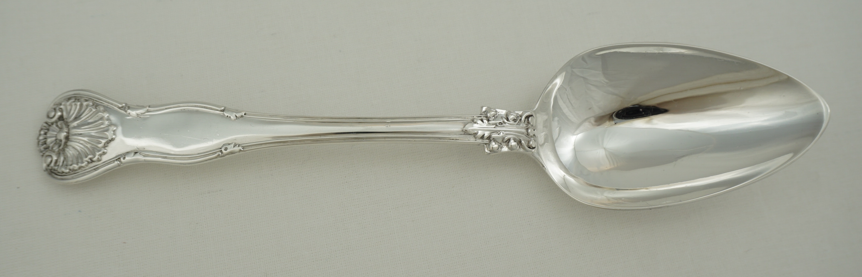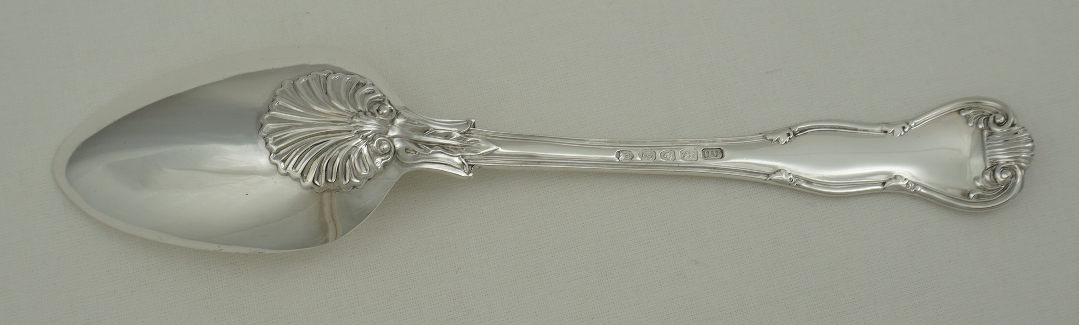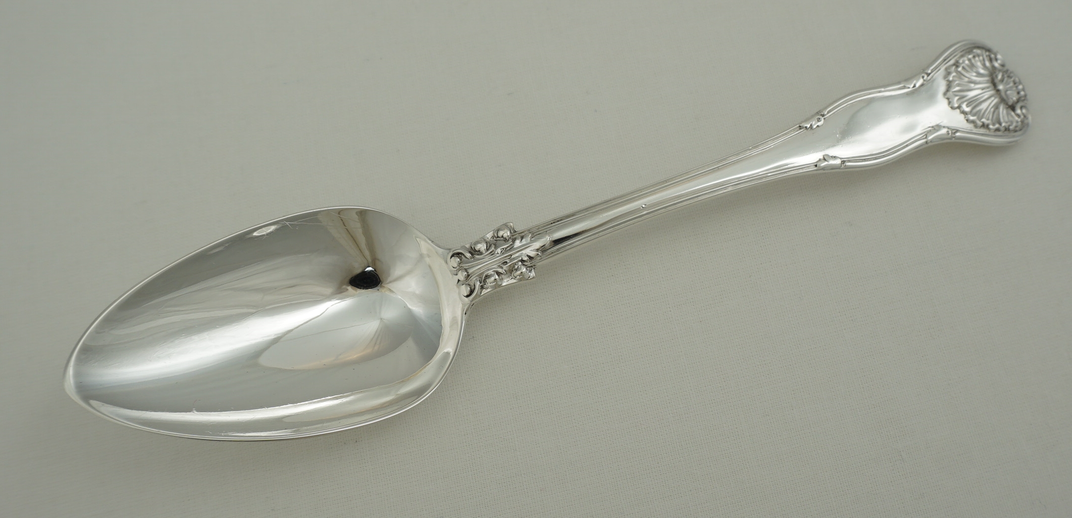 DESCRIPTION | Very good antique English William IV solid sterling silver double struck (pattern both sides) King's Husk with husk heel pattern dessert spoon. |