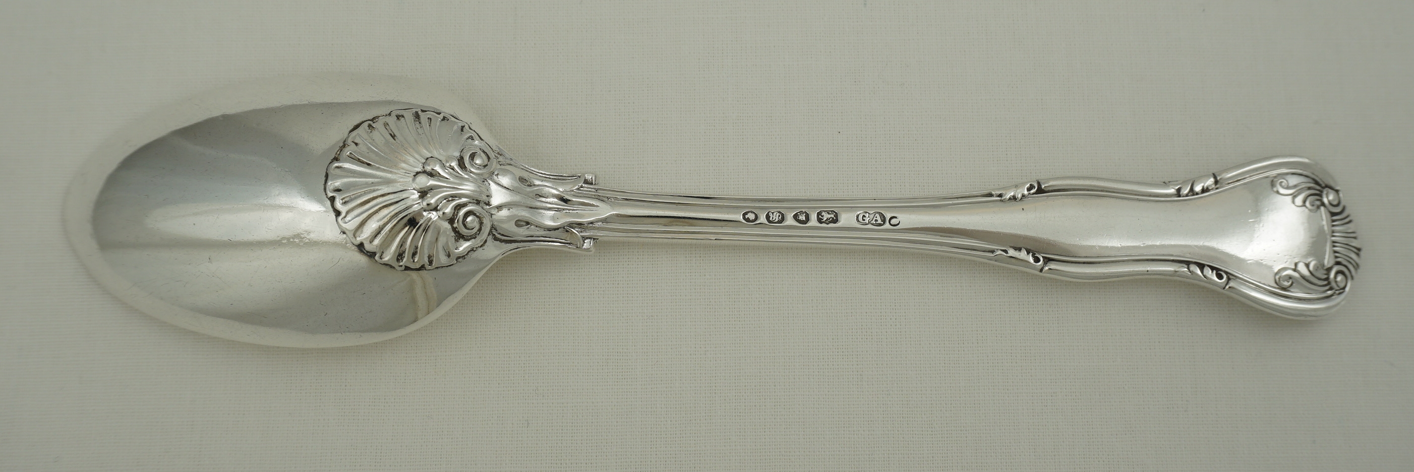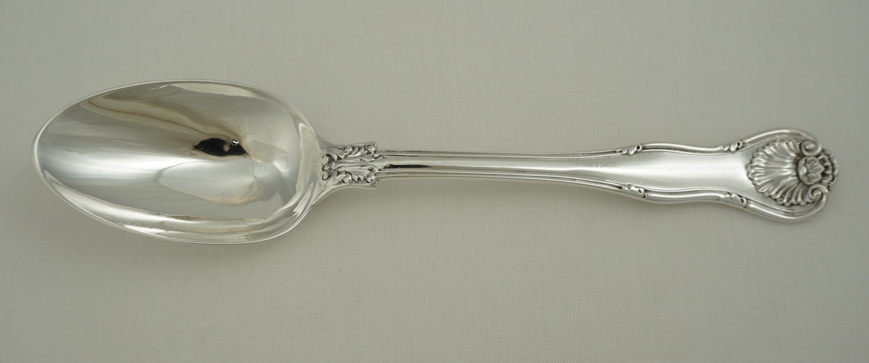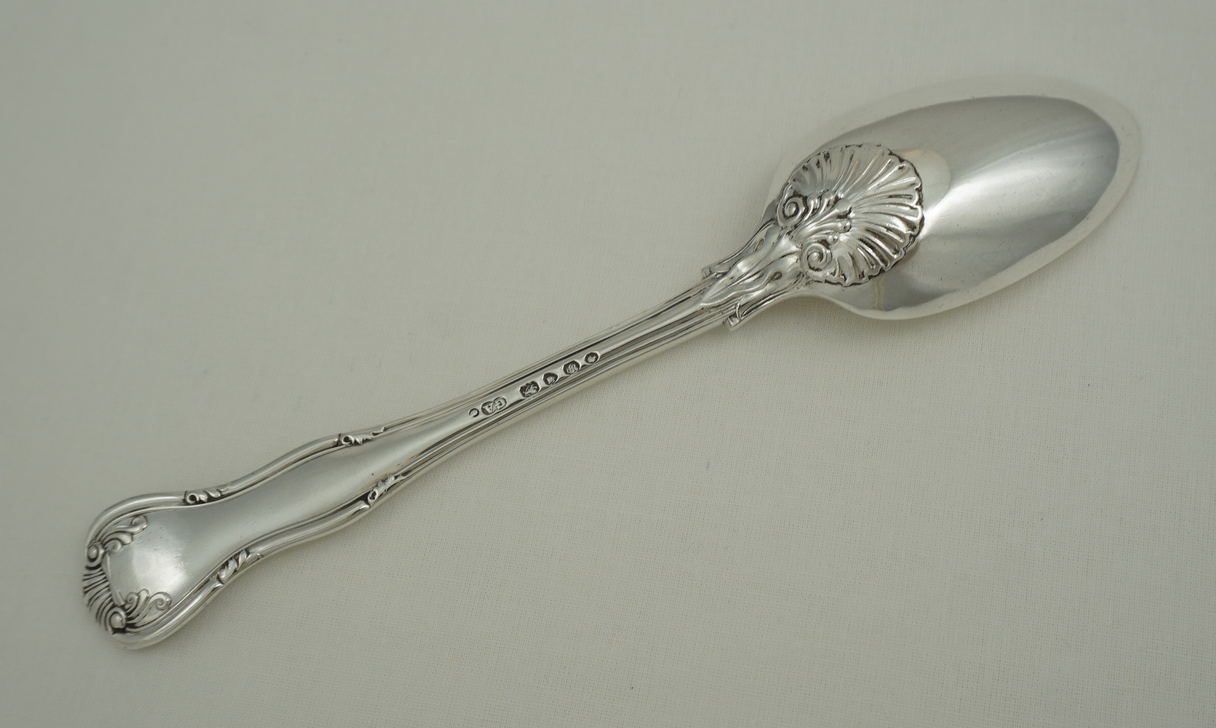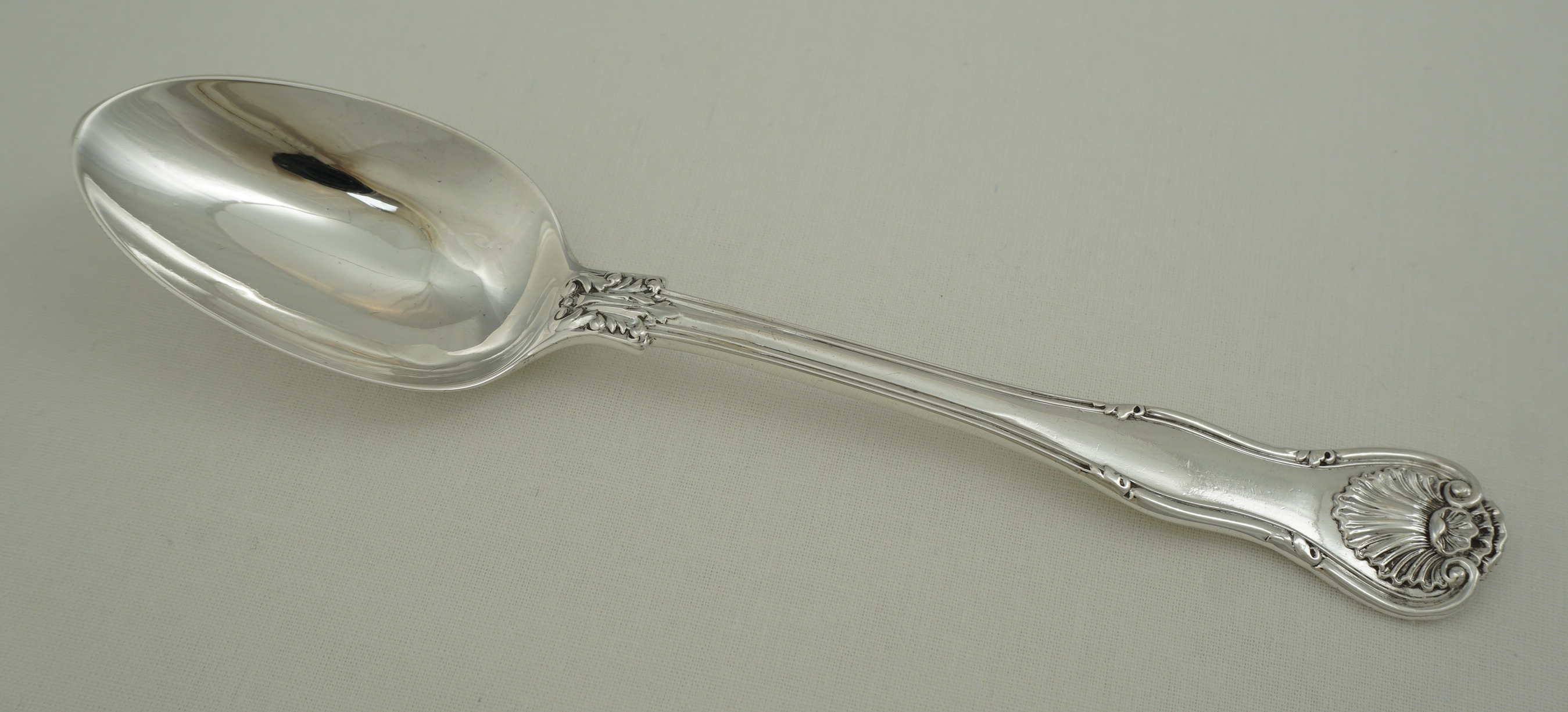 DESCRIPTION | Antique English Victorian solid sterling silver double struck (pattern both sides) King's Husk with husk heel pattern dessert spoon. |