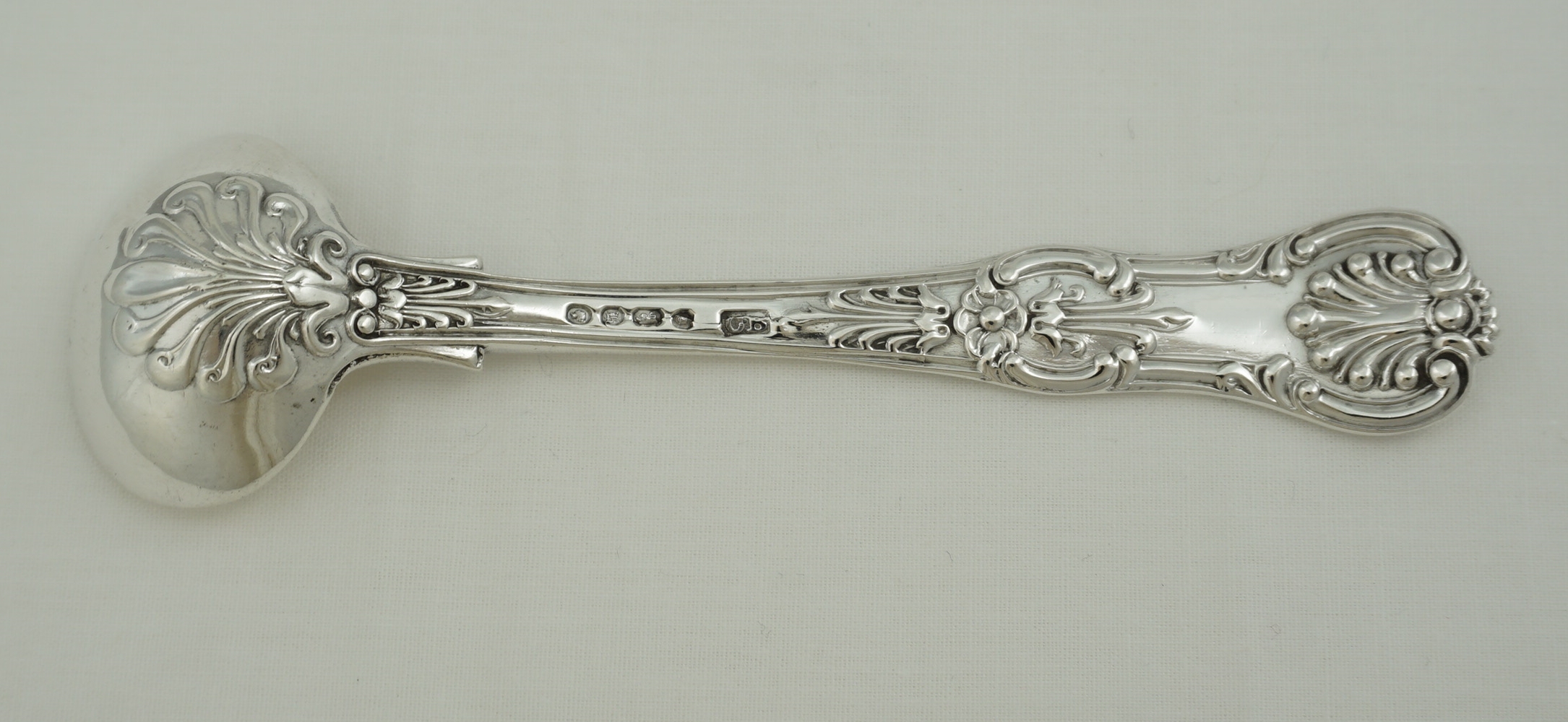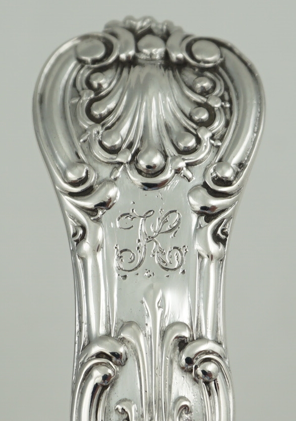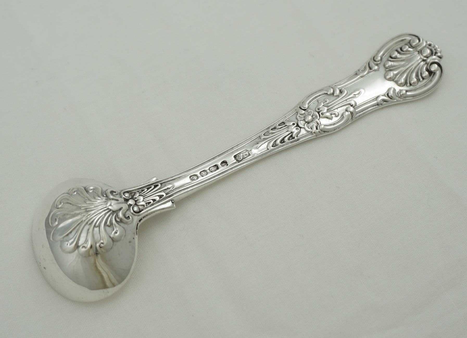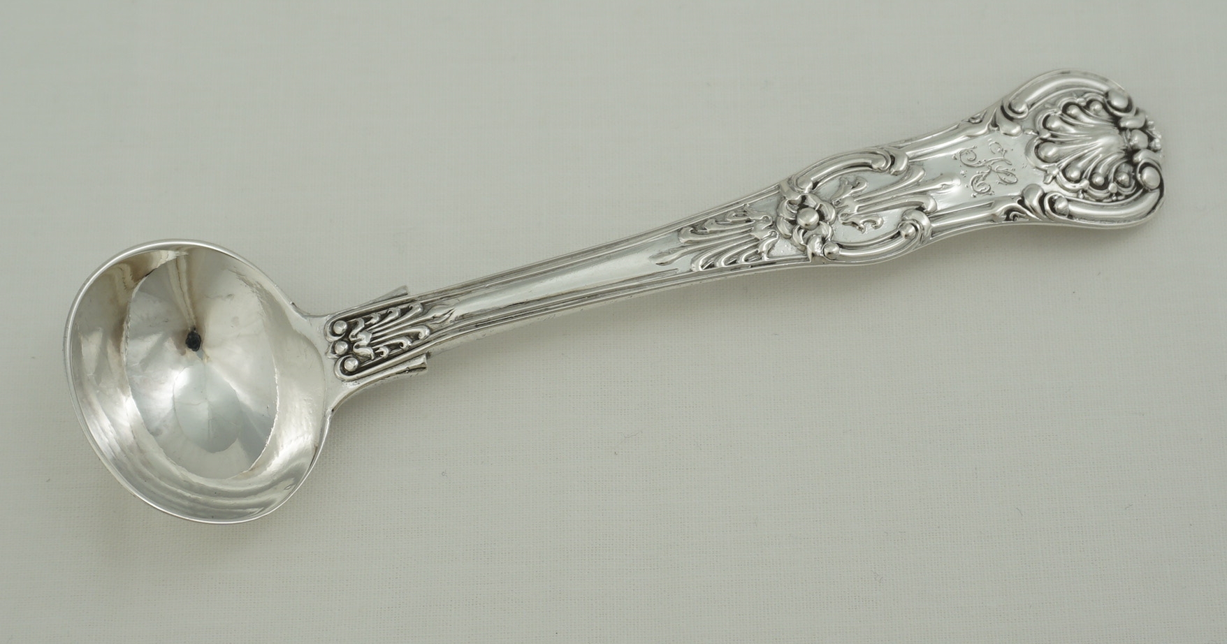 DESCRIPTION | Very good antique English Victorian solid sterling silver double struck (pattern both sides) Queen's pattern salt spoon with a frontal initial engraving over an erasure. |