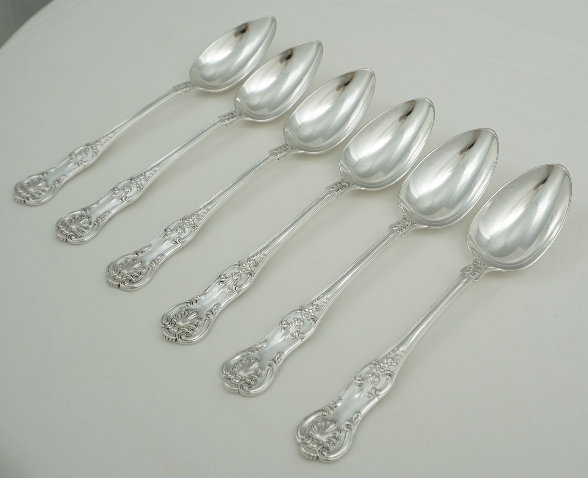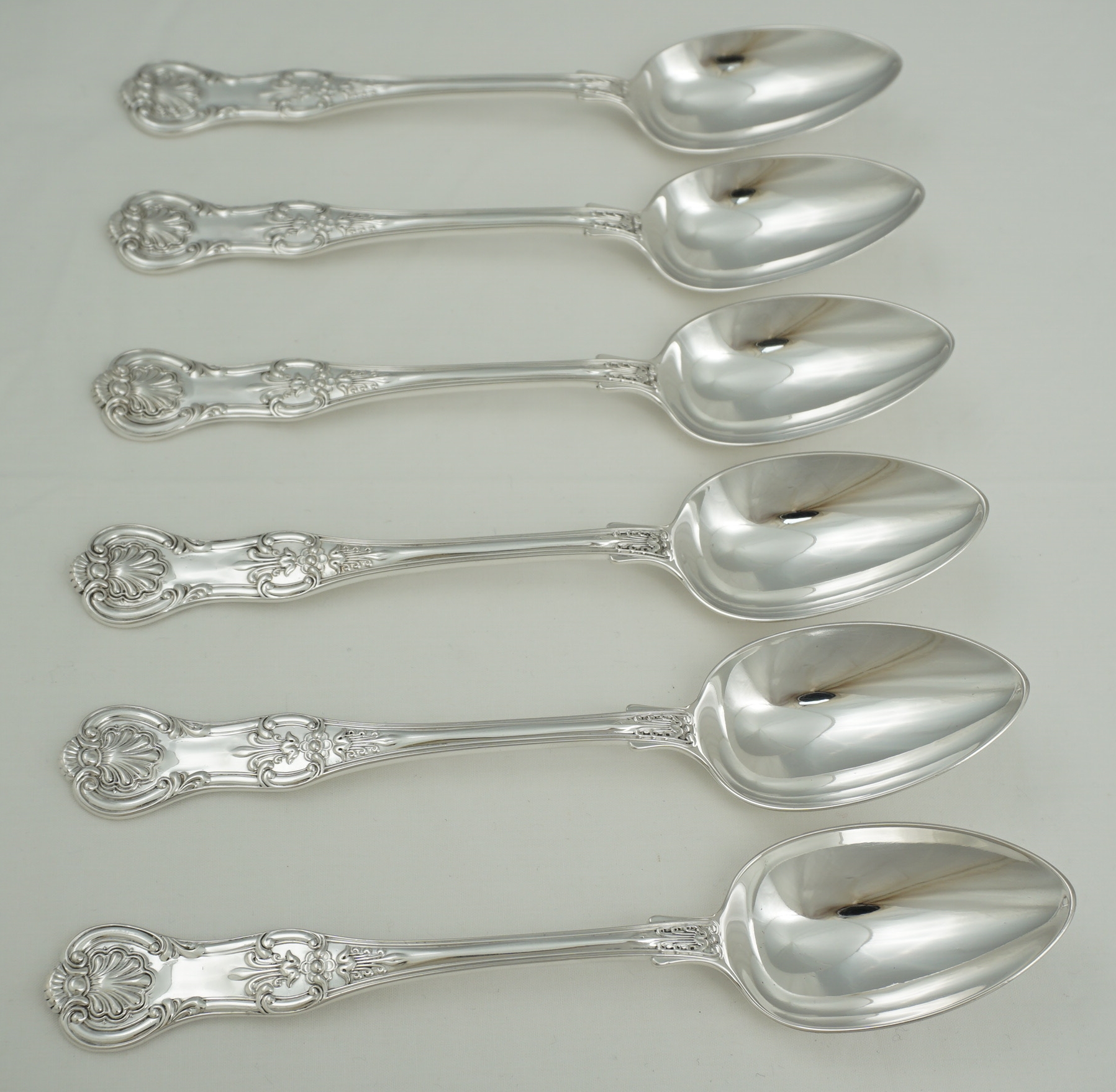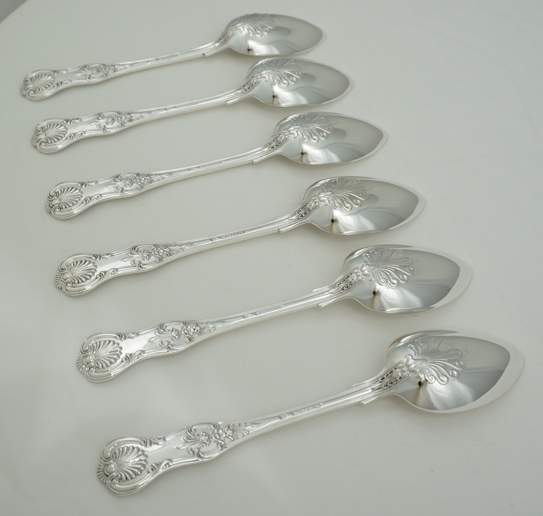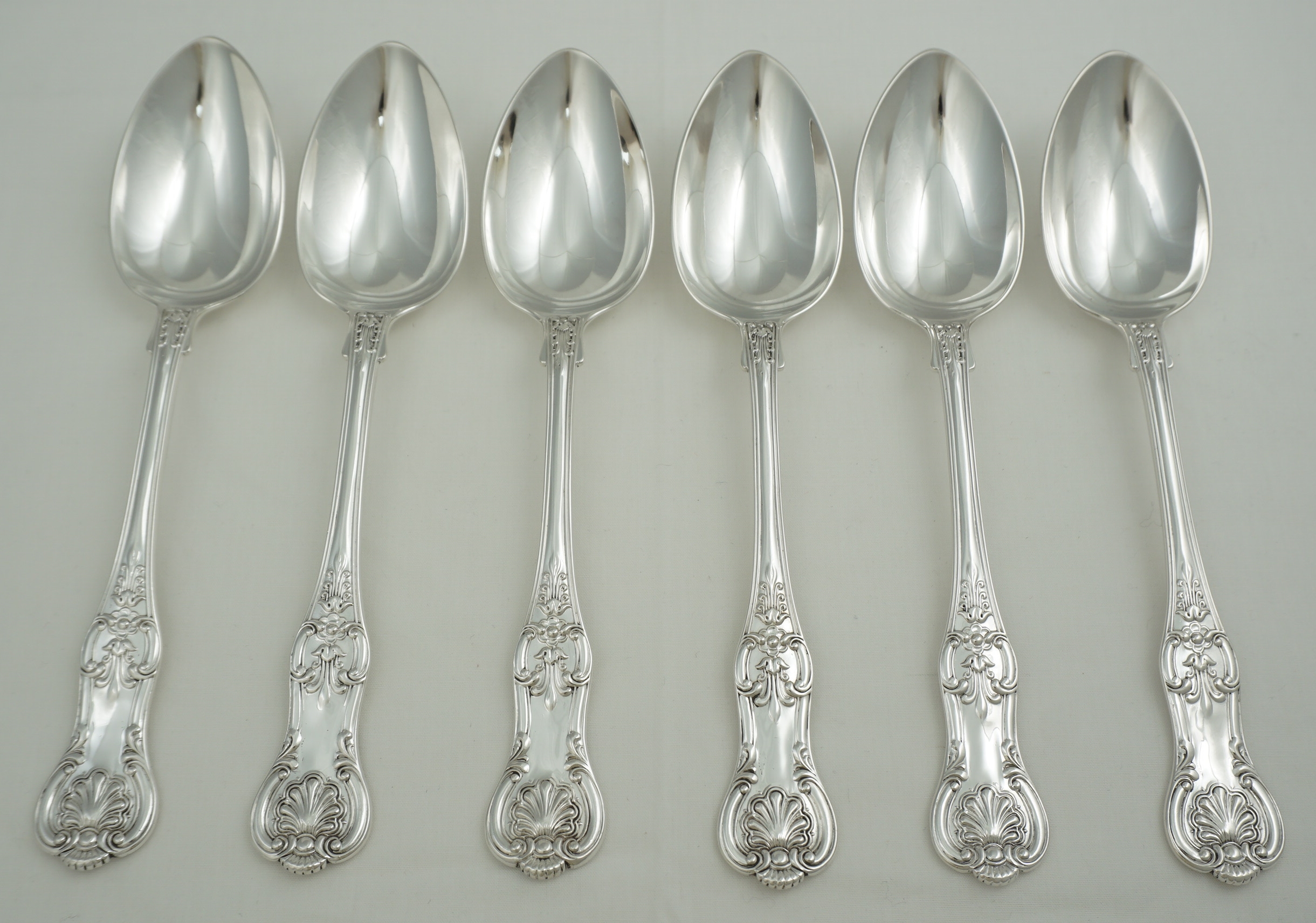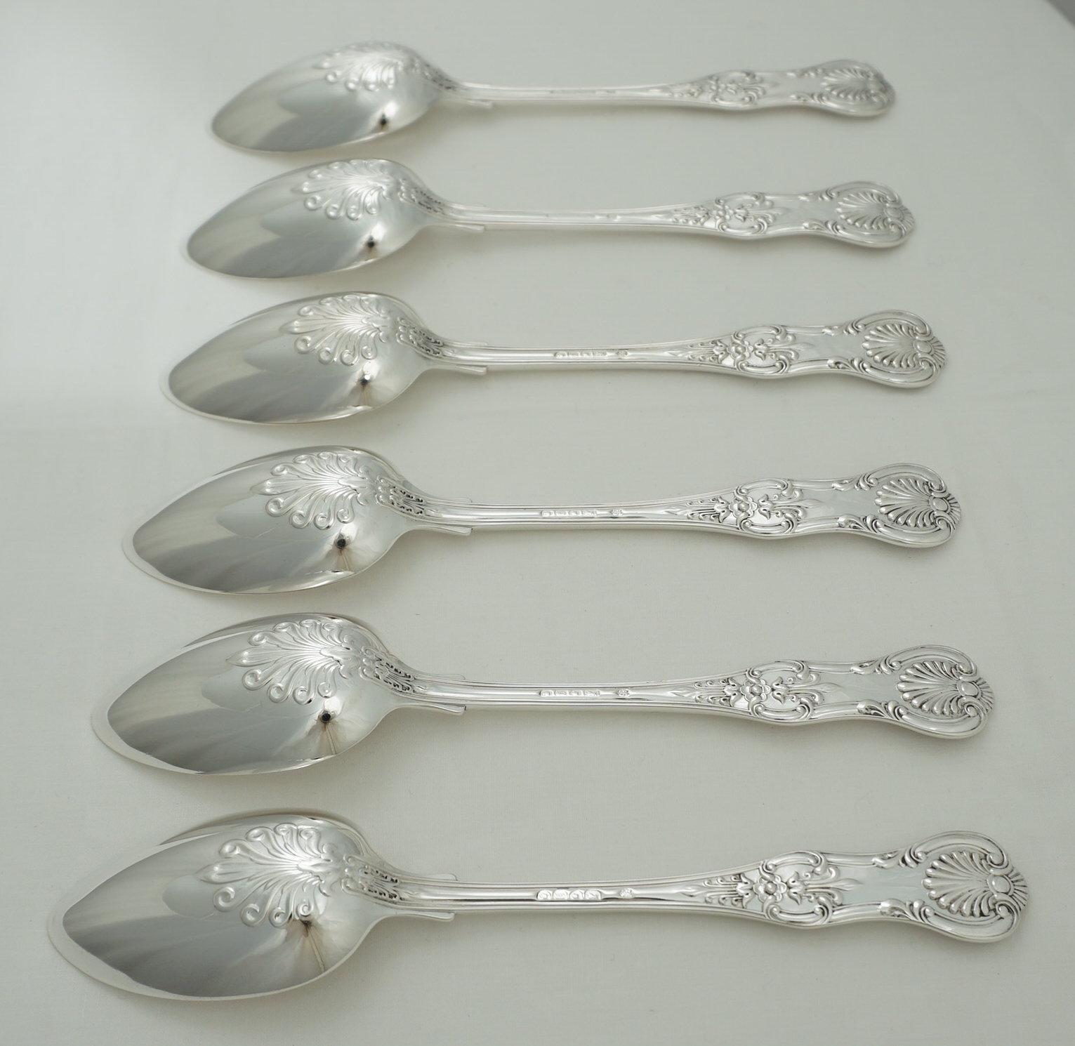 DESCRIPTION | Good set of six antique English Victorian solid sterling silver double struck (pattern both sides) Queen's pattern dessert spoons. I have added a pair of single struck silver plated dessert spoons free of charge. |