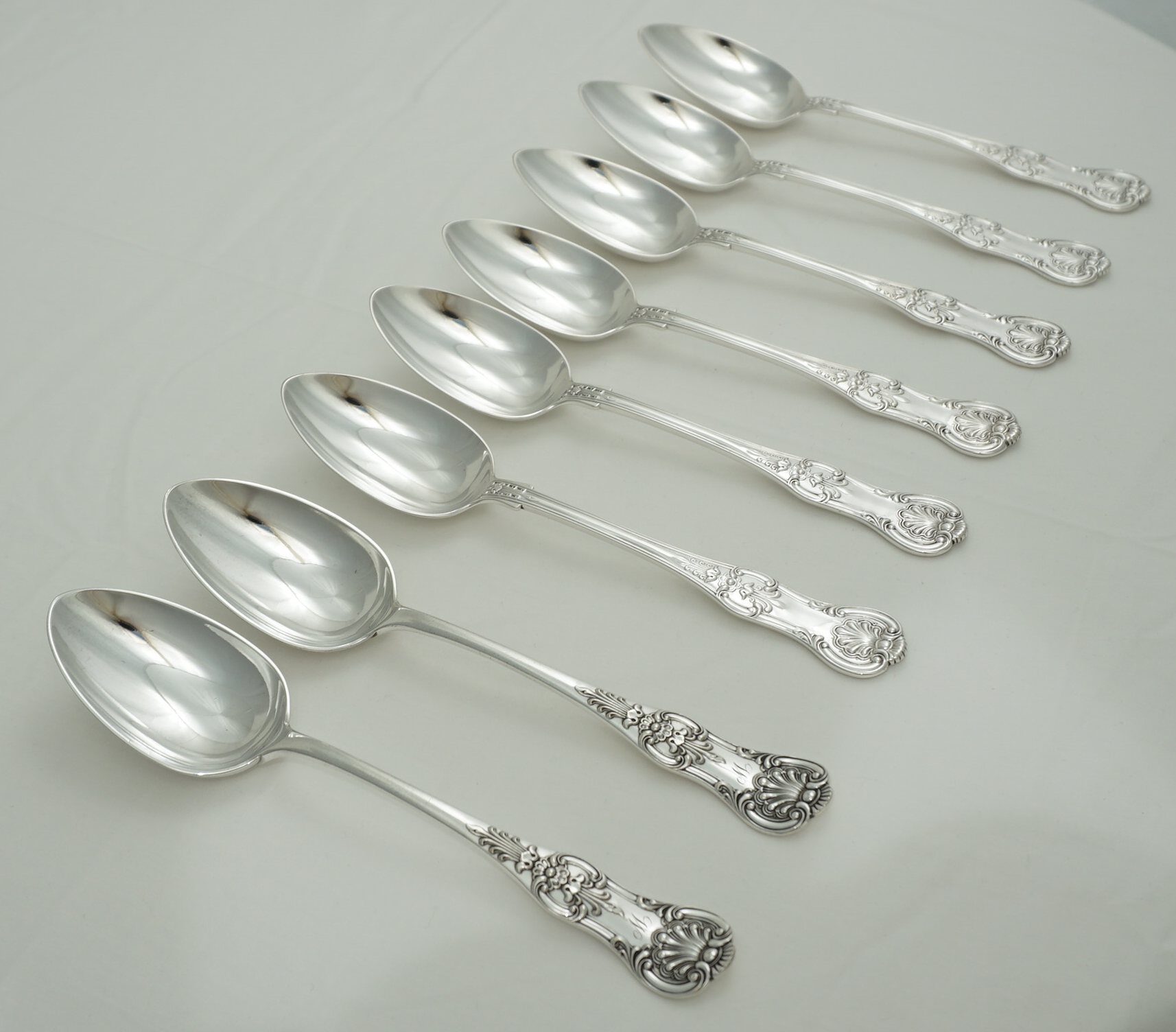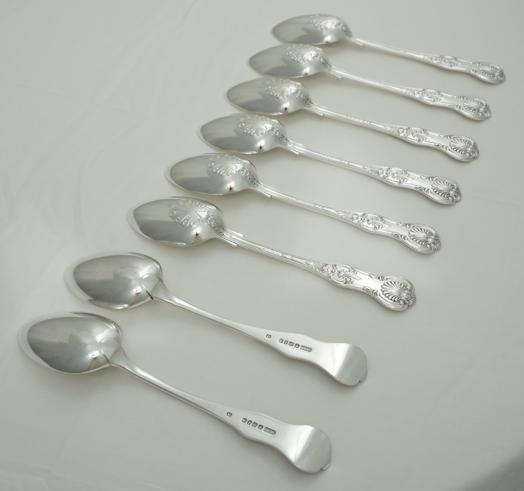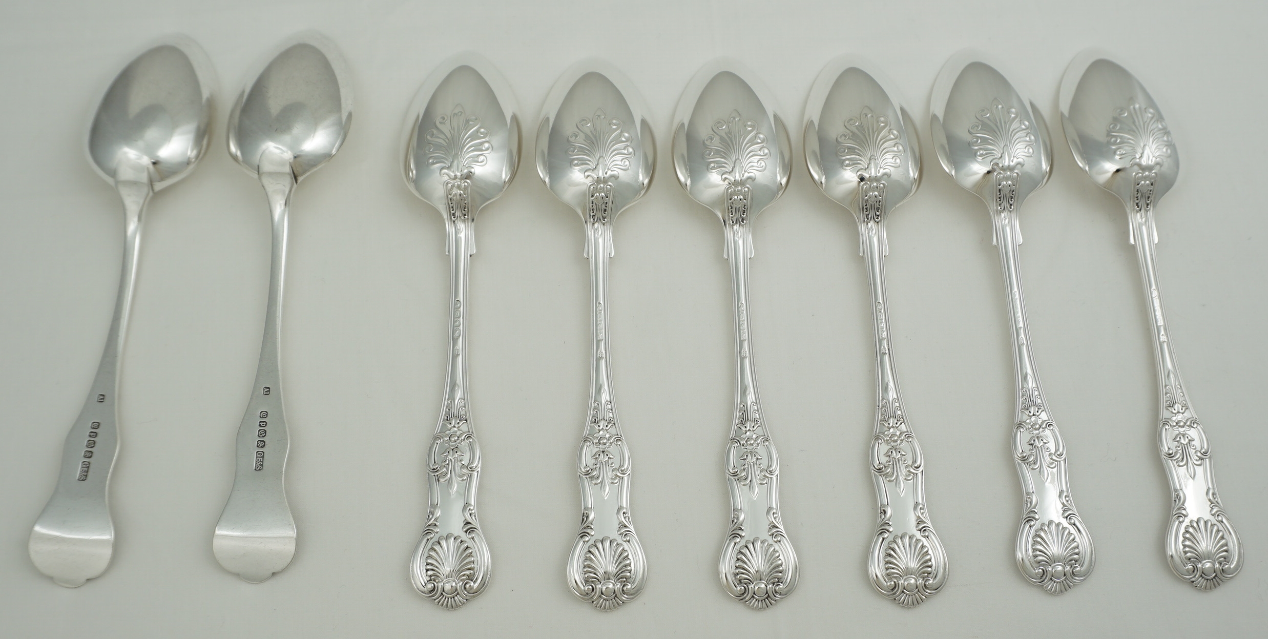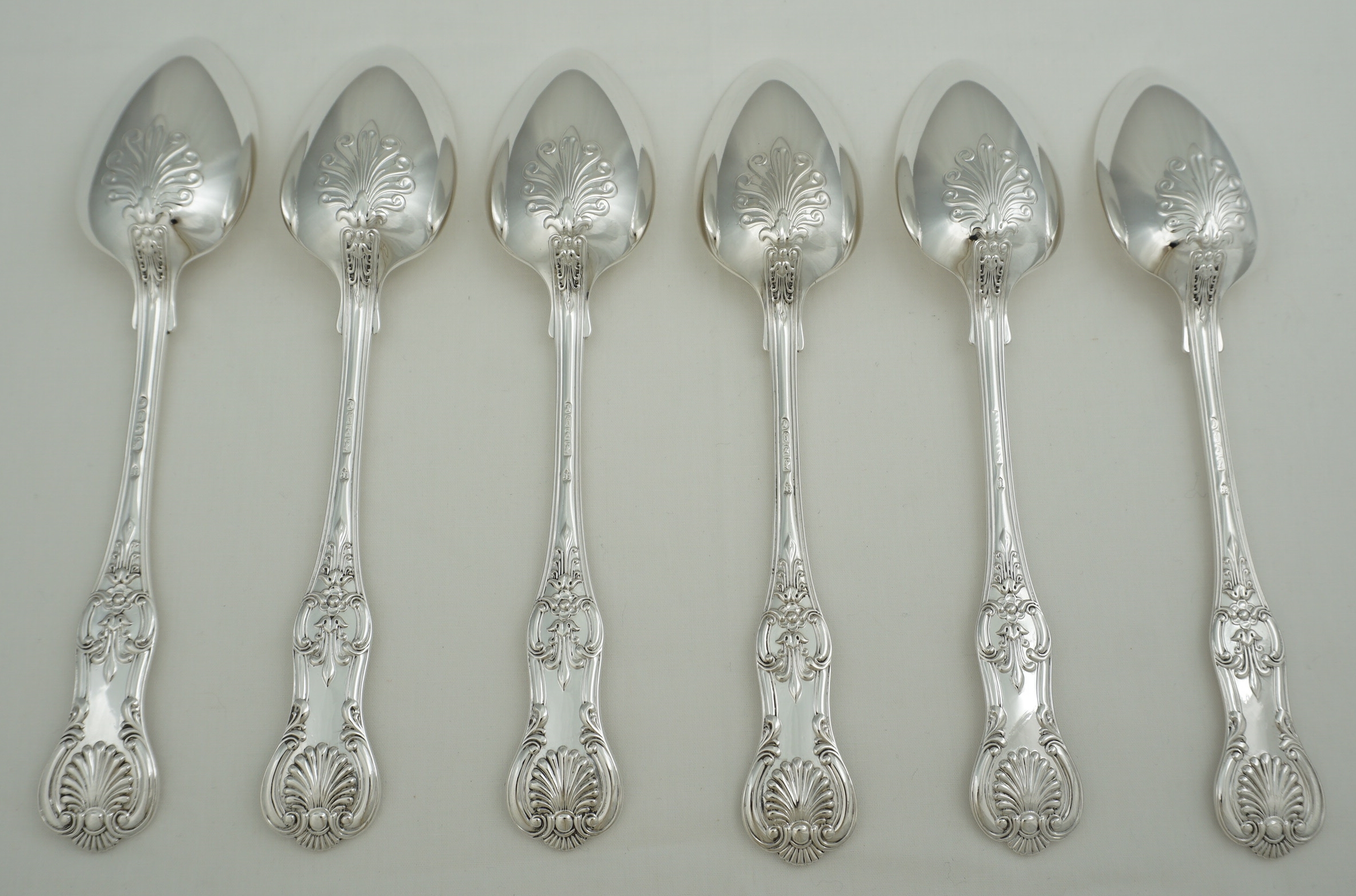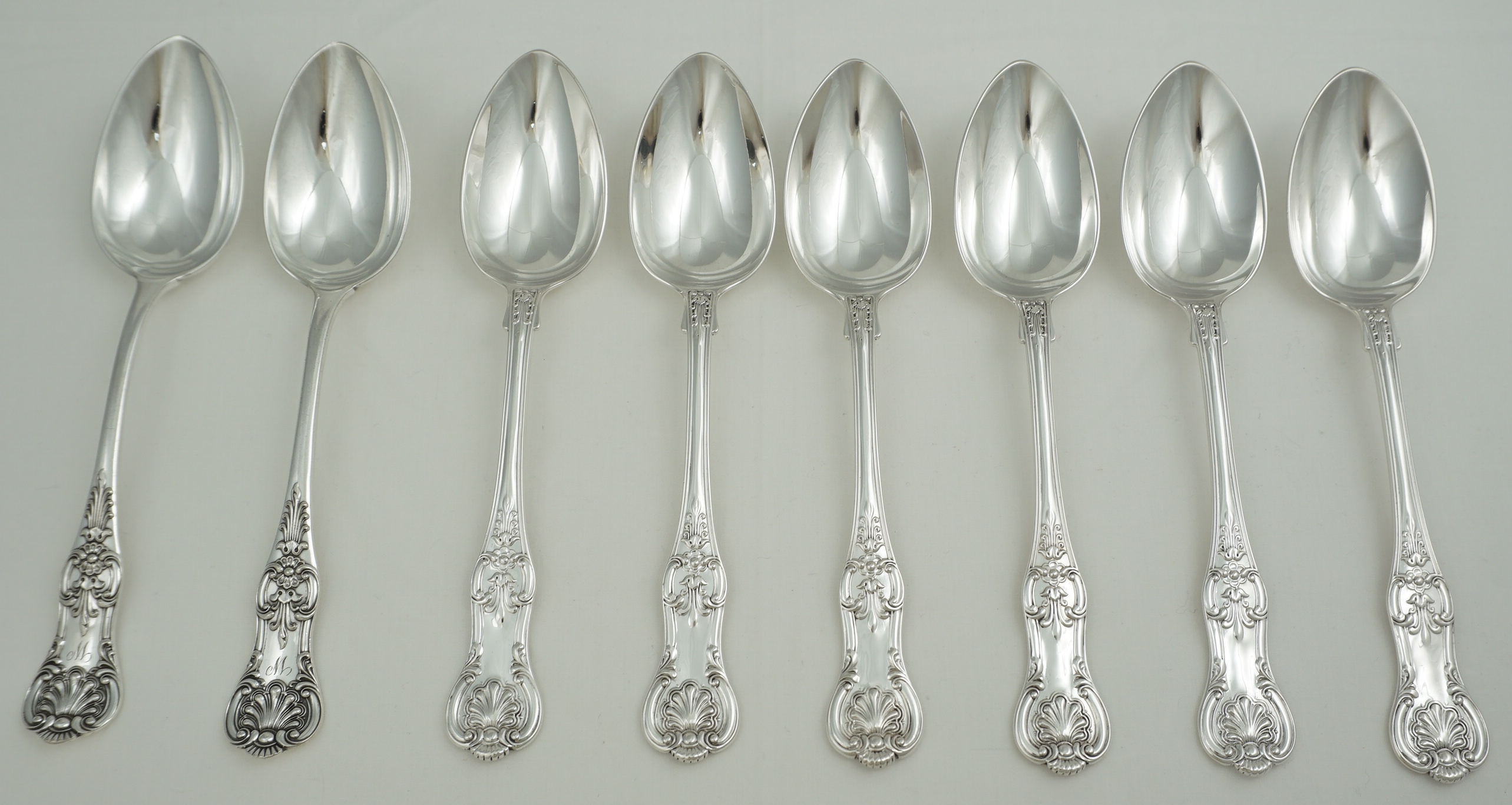 DESCRIPTION | Good set of six antique English Victorian solid sterling silver double struck (pattern both sides) Queen's pattern dessert spoons. I have added a pair of single struck silver plated dessert spoons free of charge. |