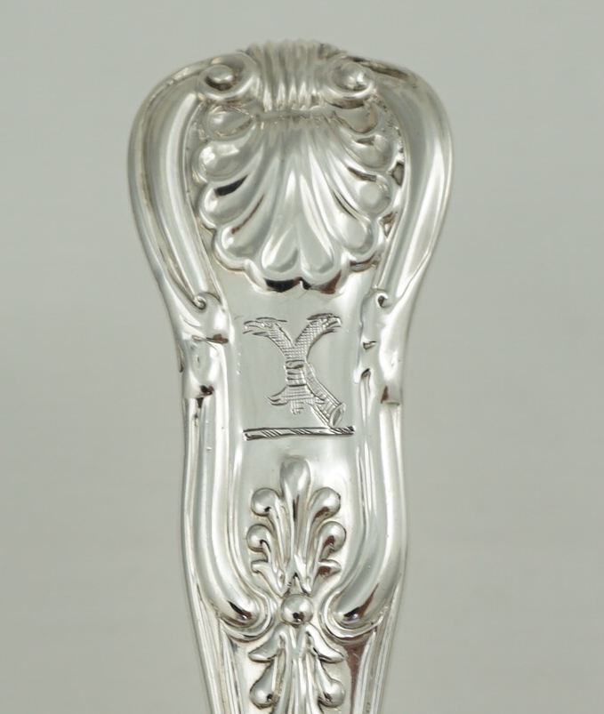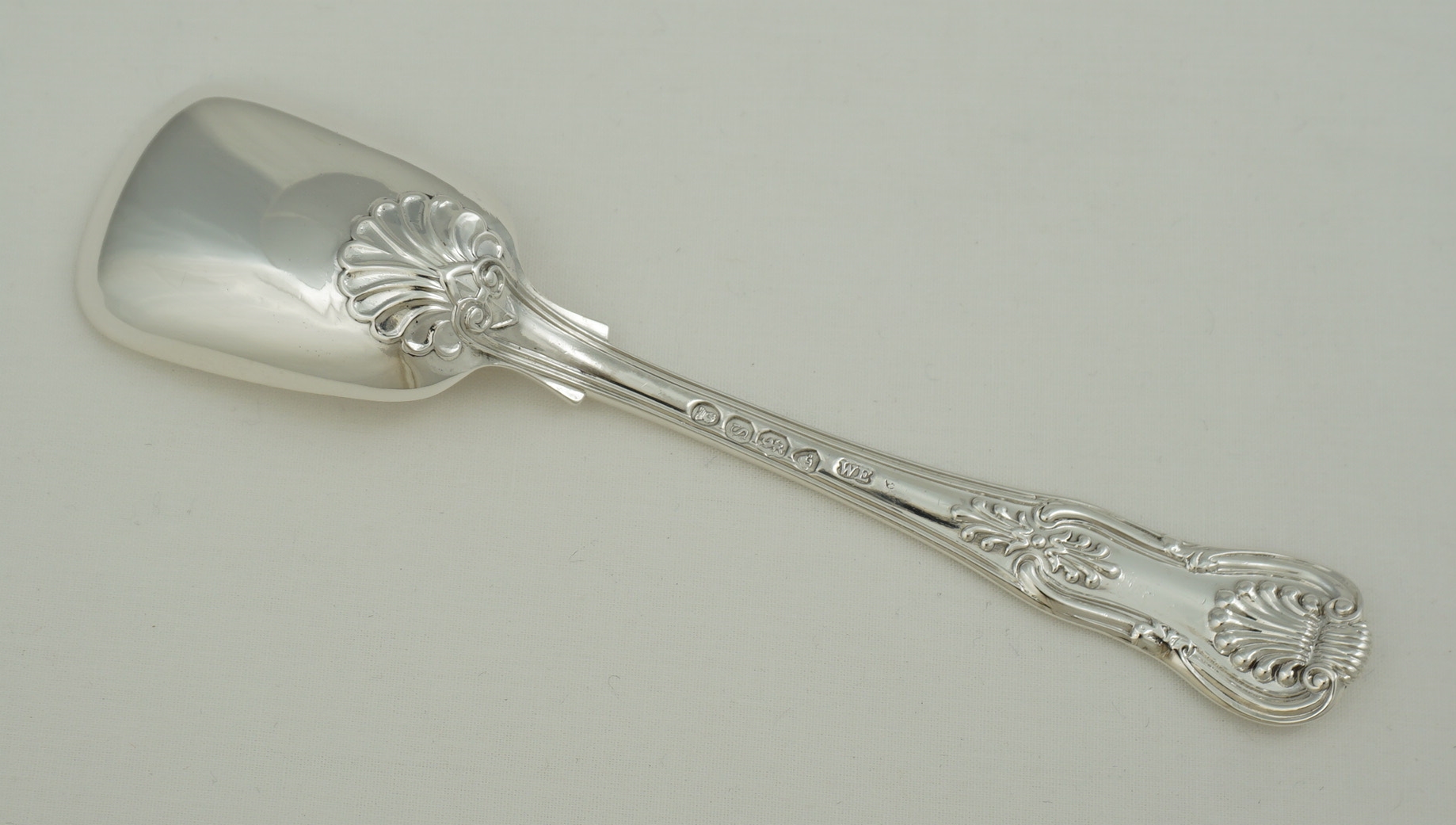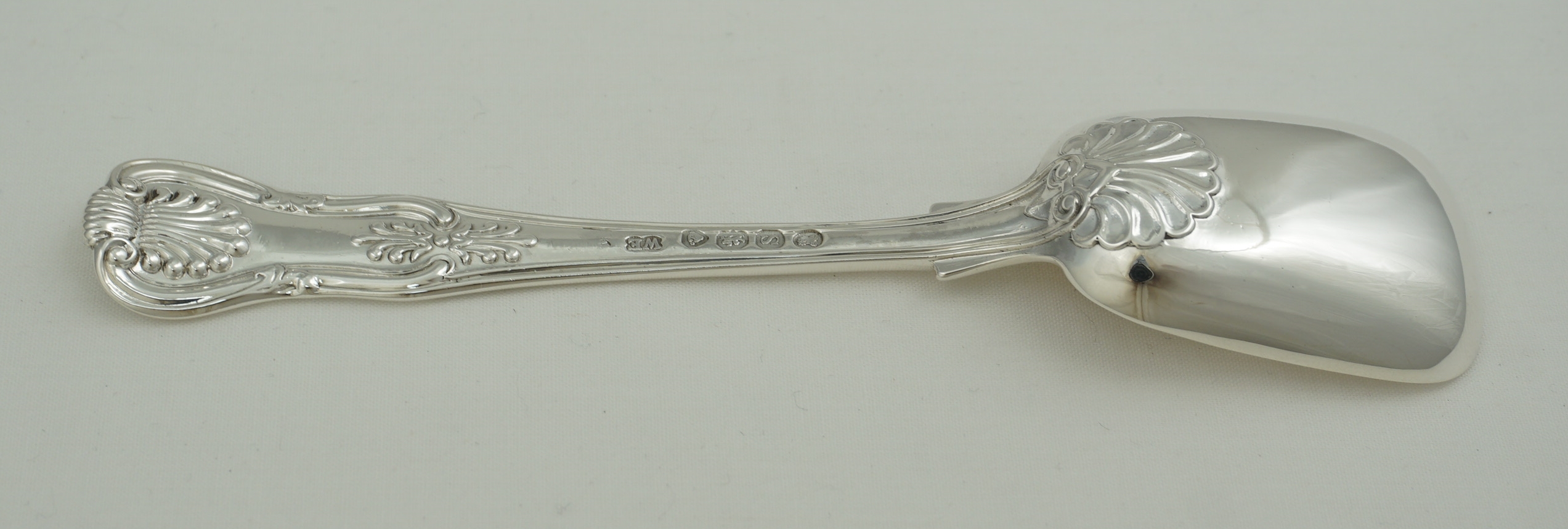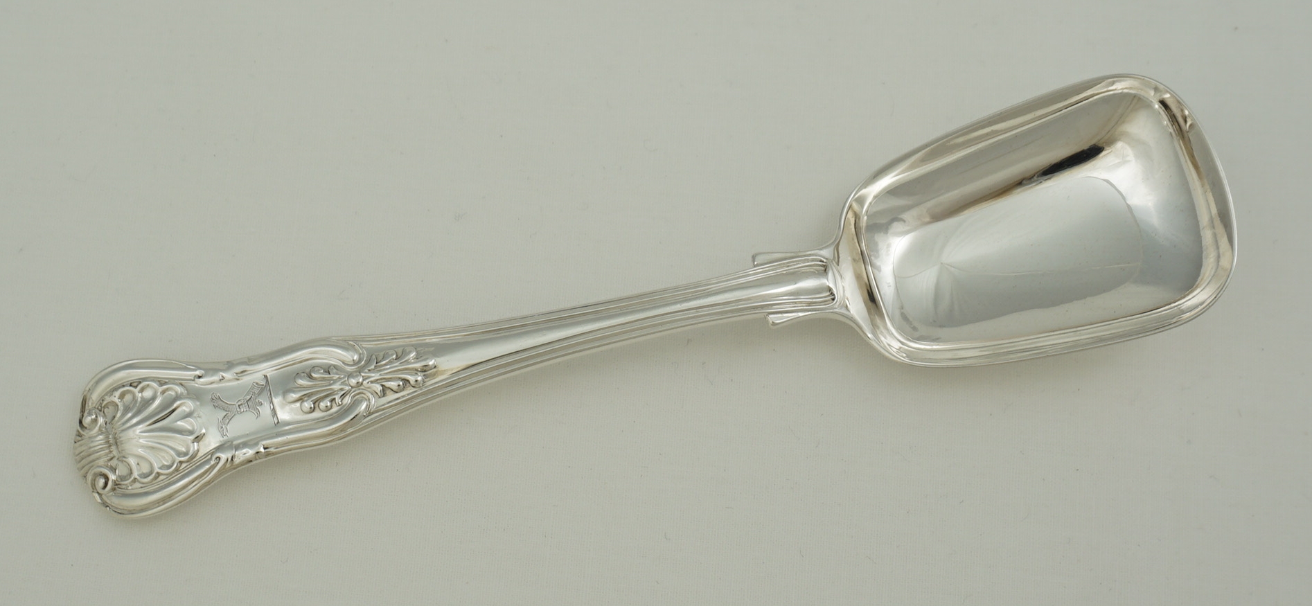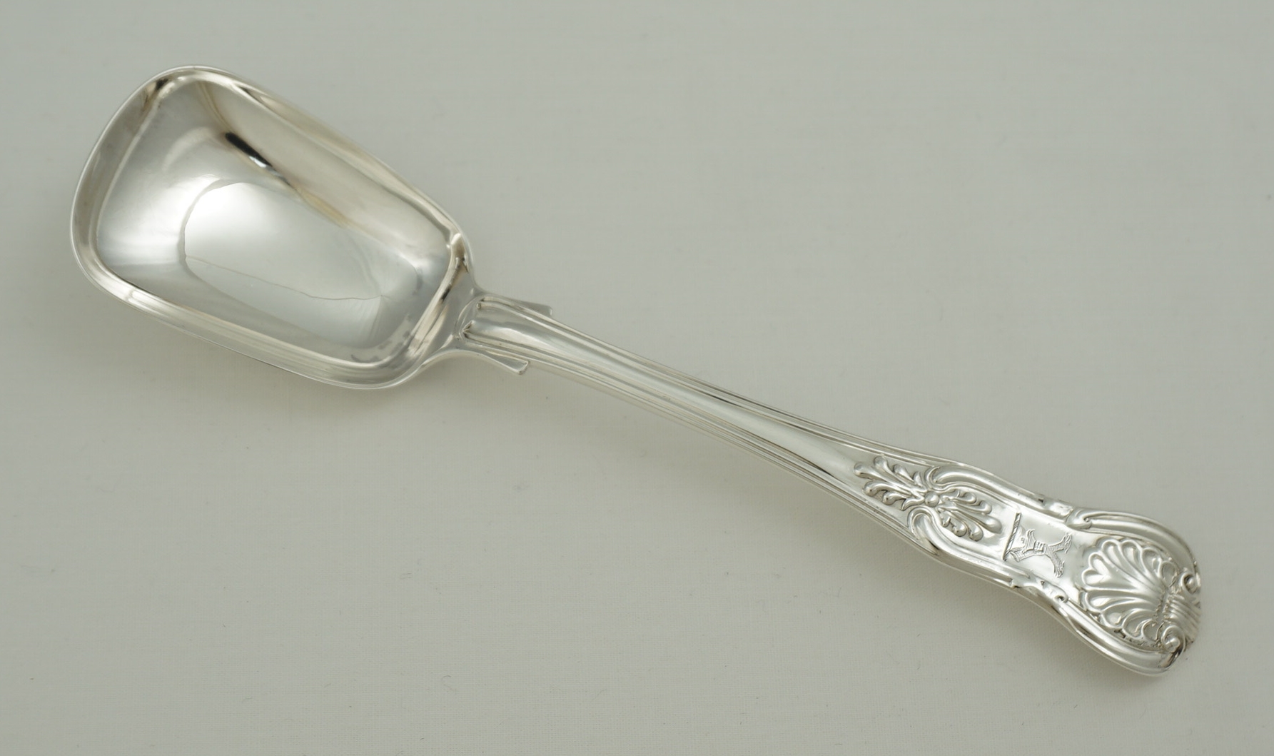 DESCRIPTION | Very good antique English William IV solid sterling silver double struck (pattern both sides) King's pattern preserve shovel with a nice frontal crest engraving over a well executed erasure. |