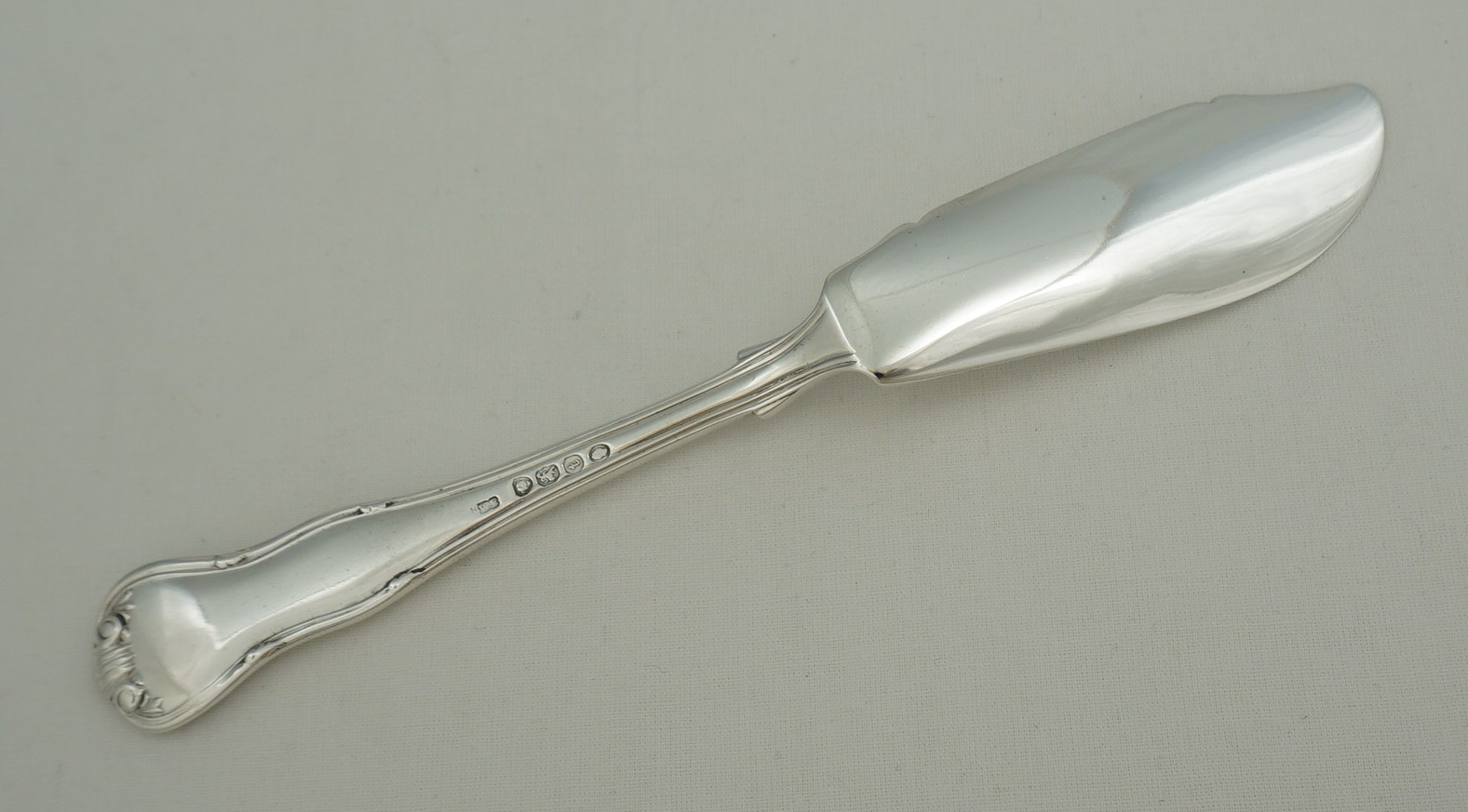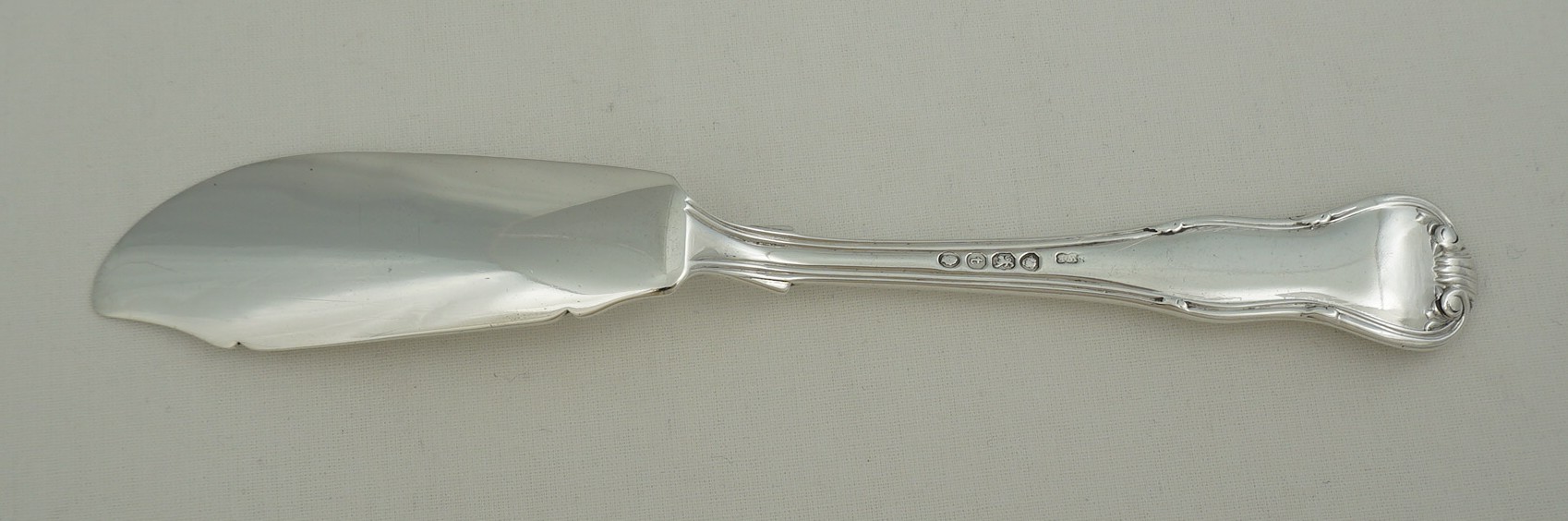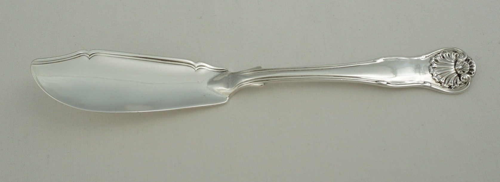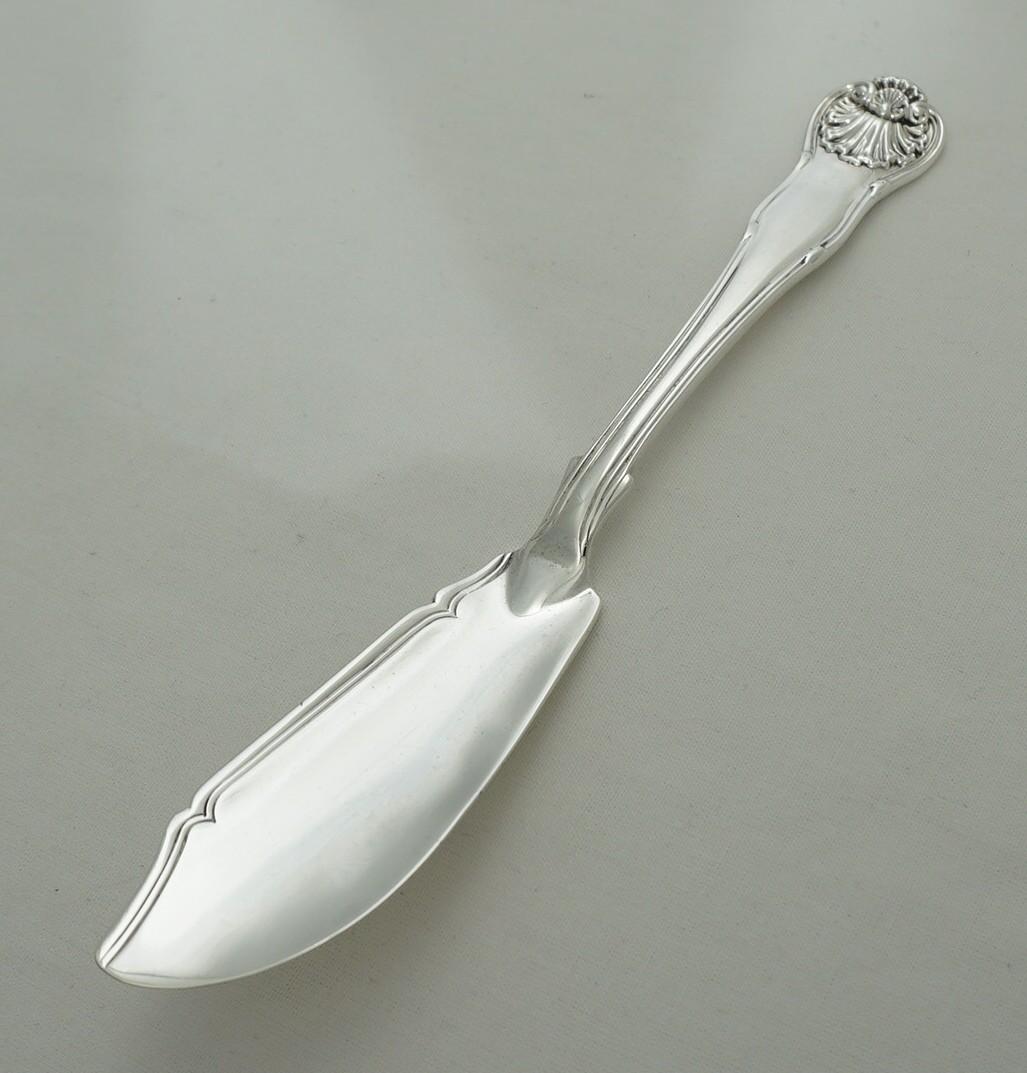 DESCRIPTION | Heavy antique English William IV solid sterling silver King's Husk pattern butter knife. |