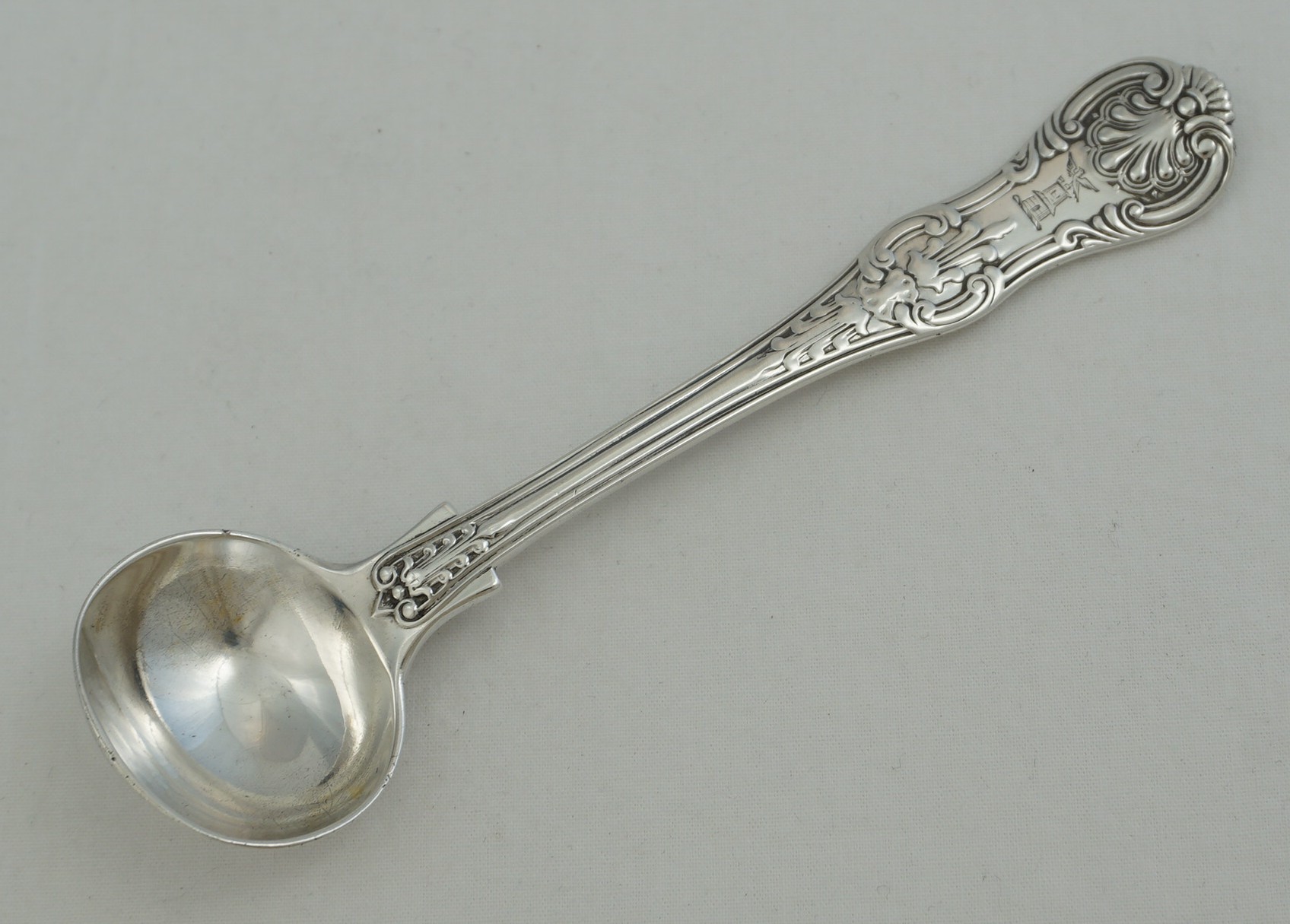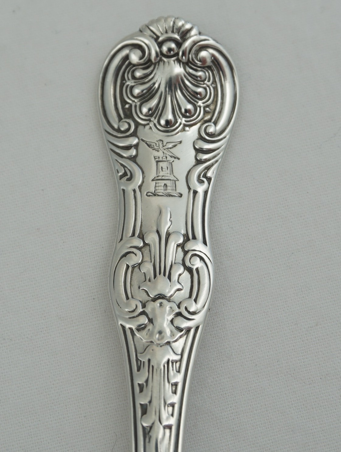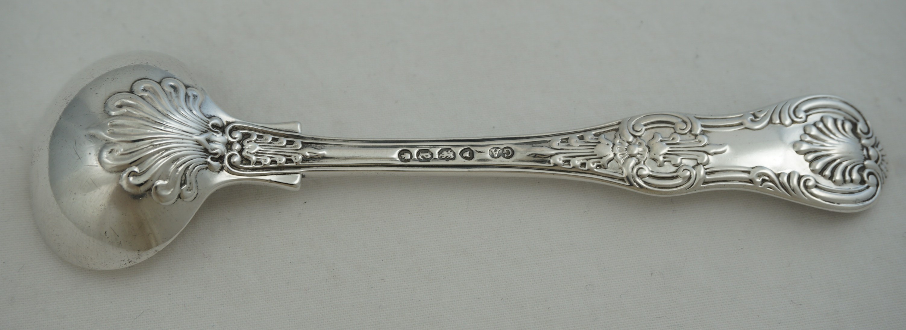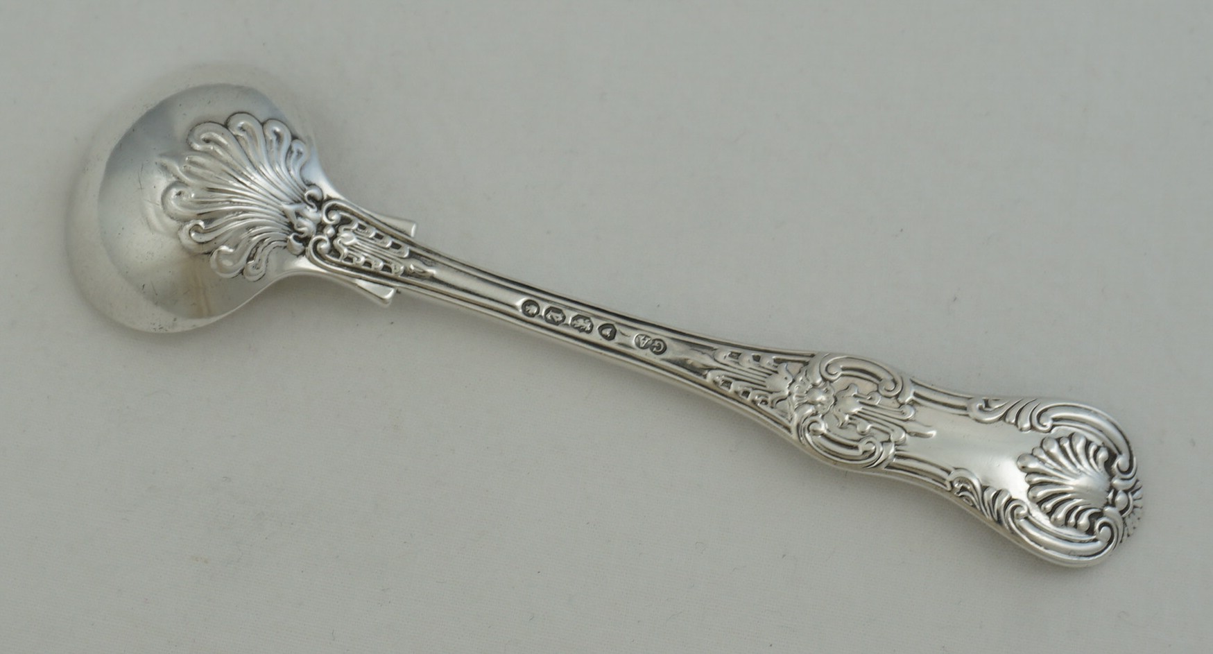 | DESCRIPTION | Good quality and hefty antique English Victorian solid sterling silver double struck (pattern both sides) Queen's pattern salt spoon with the original frontal crest engraving and no erasures. |