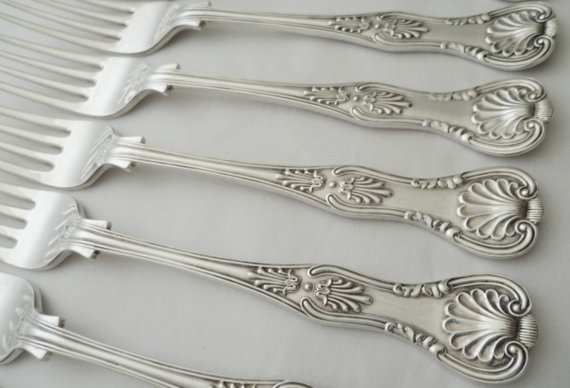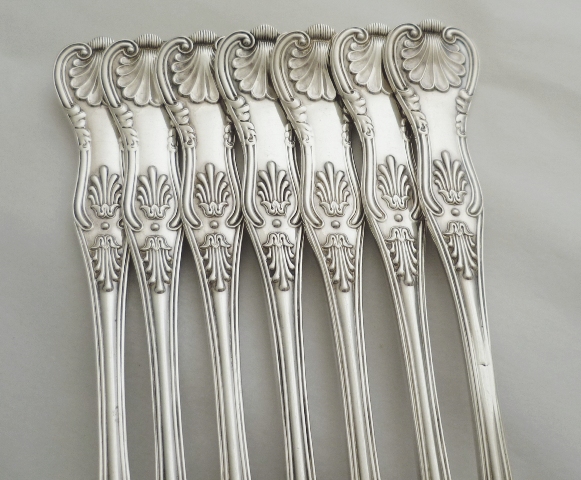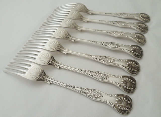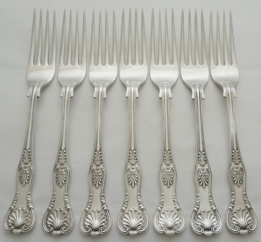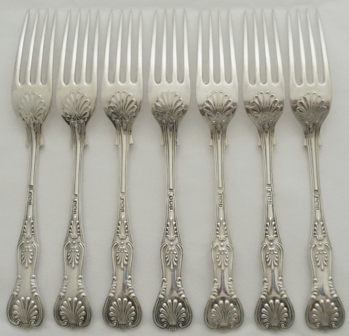 Good set of seven silver double struck King's pattern dessert forks with diamond shell heels. |