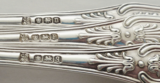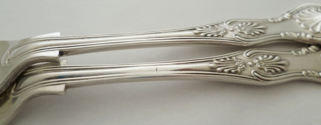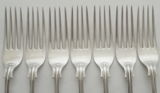 excellent with full length and level tines, no engravings or erasures. Fork far right in first image has a flaw mid-stem, most likely from a trapped then compressed tiny gas bubble when the silver ingot was initially worked. I expect that it felt rough to touch and so has been softened by polishing. This polish has also softened the thread decoration directly next to it on one side, see penultimate image. |