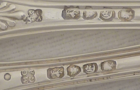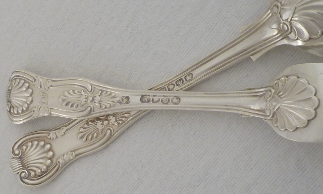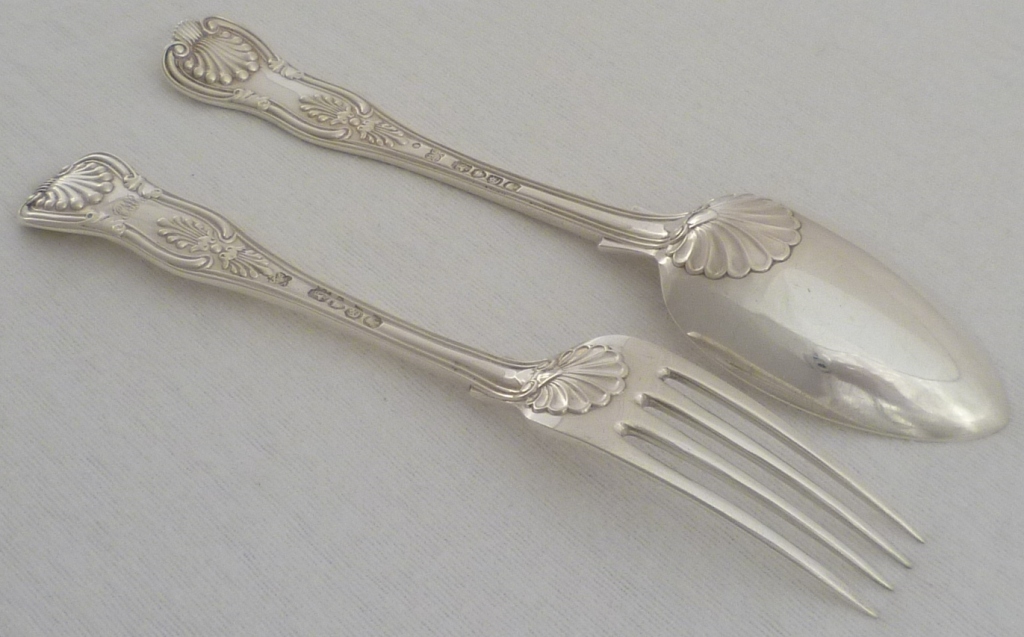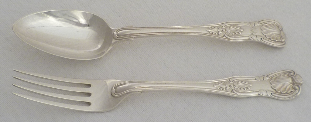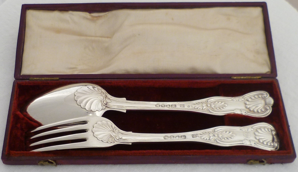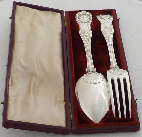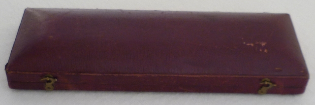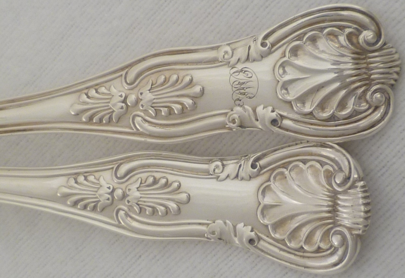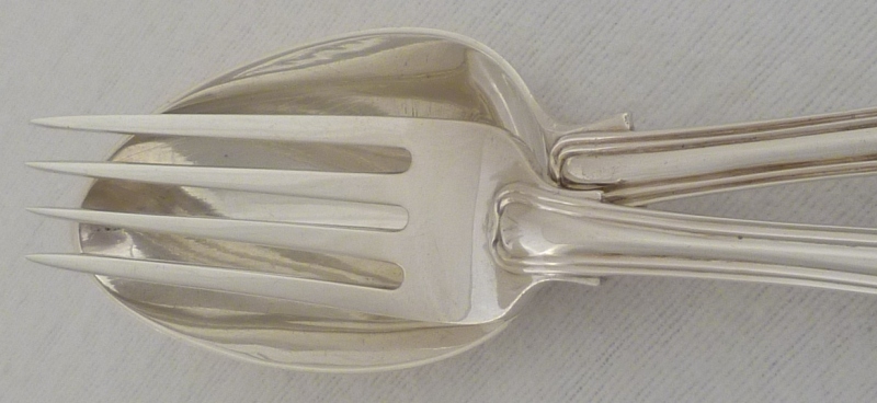 Early Victorian silver child's set of double struck King's pattern with diamond shell heels. Each piece lightly engraved once with the first owner's monogram otherwise exactly as made in 1840. Must have been gifted and then ignored until now. The leather bound case is lined with silk and velvet. |