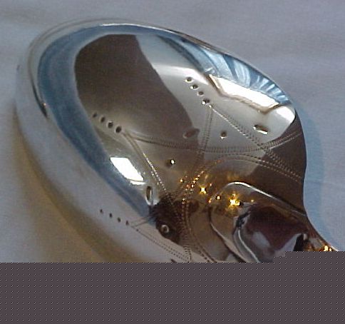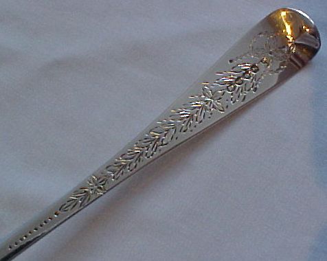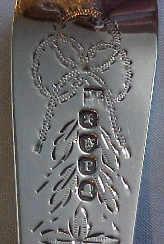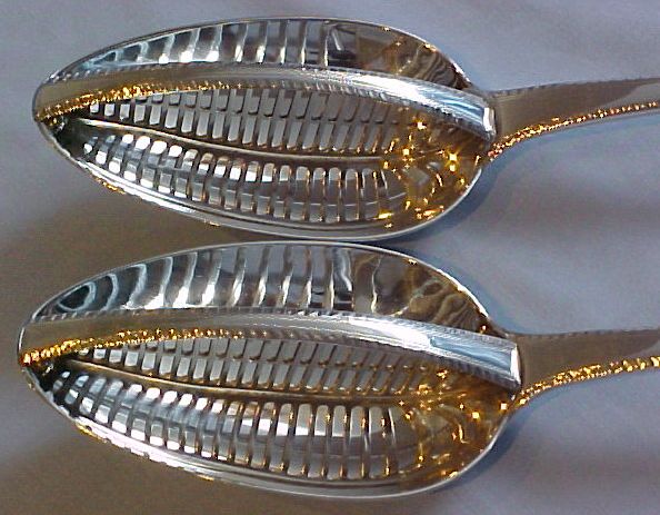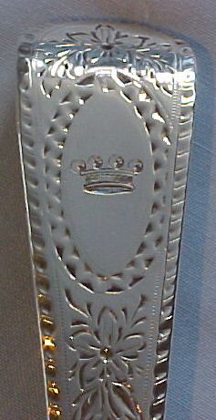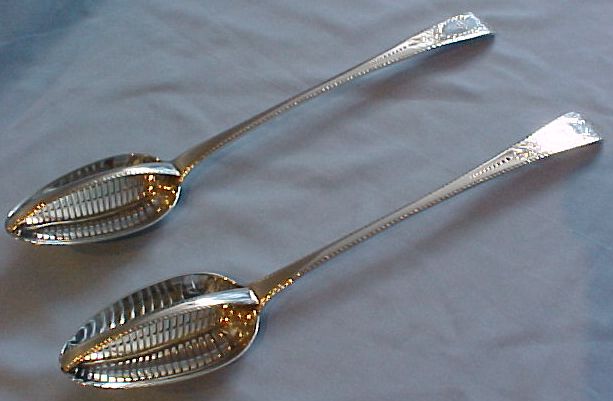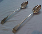 A pair of Georgian silver Old English Feather Edge pattern straining spoons, each engraved with a Baronet's coronet and probably later bright cut ribbon tied garlands. These spoons are usually Irish, however here I have a much rarer English pair. |