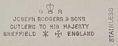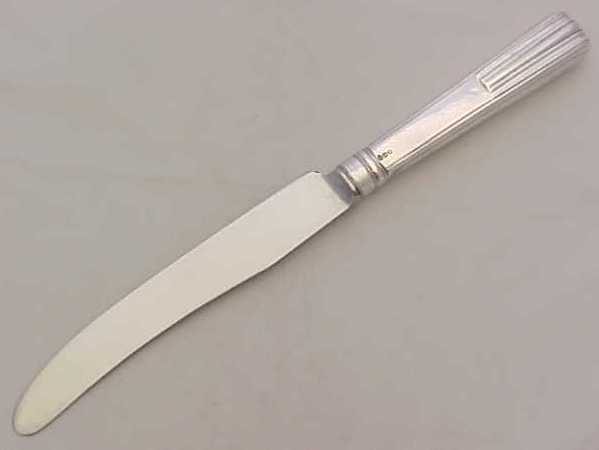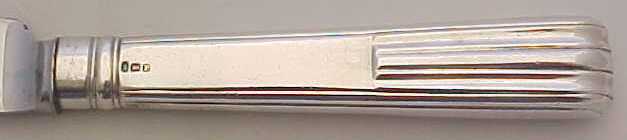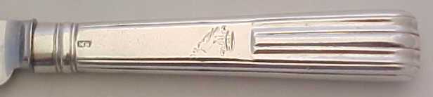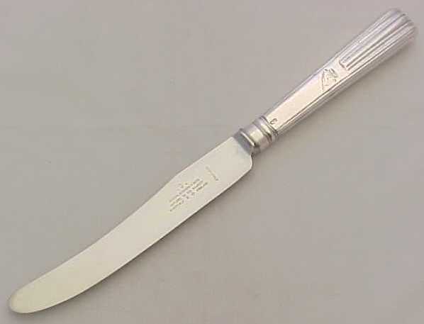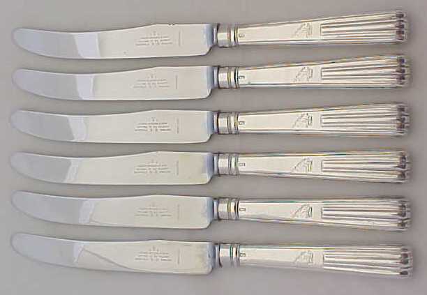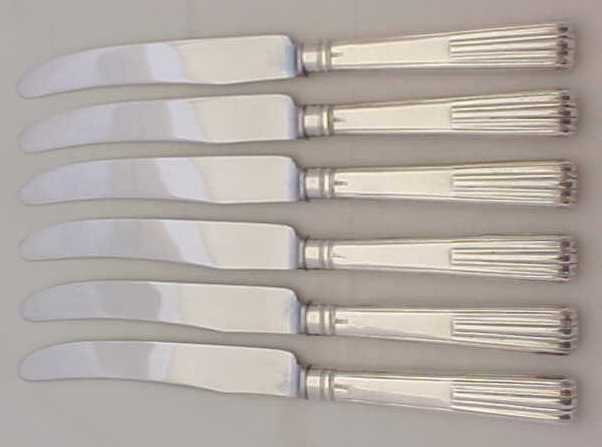 Set of six Georgian silver Old English pattern table knives with a simple crest engraving to one side and stainless steel blades. Although marked GR, these blades are George V/VI not George II/IV and so are safe for food use. |