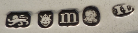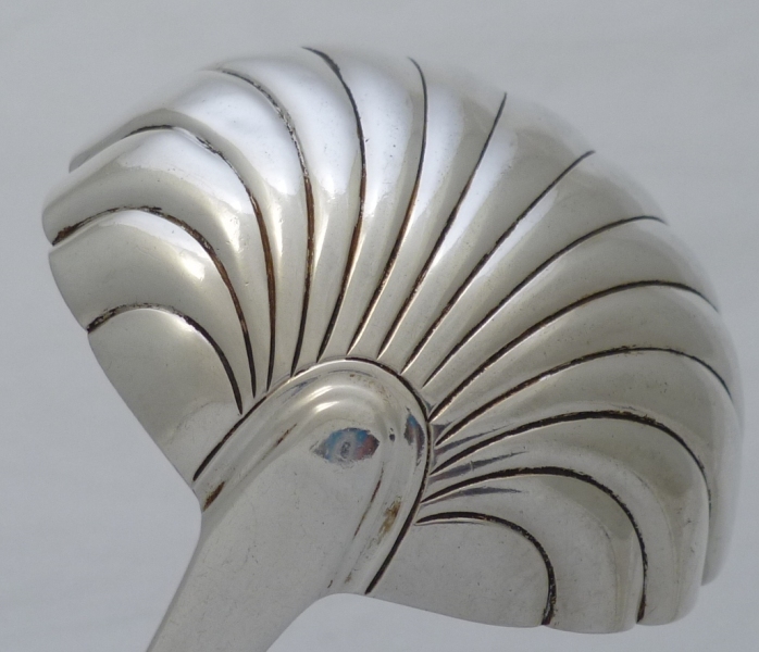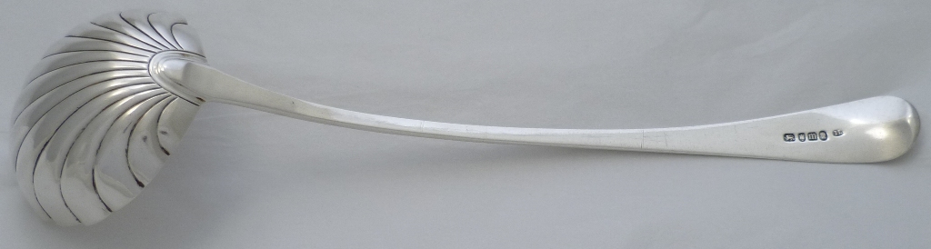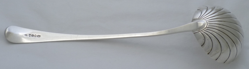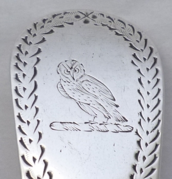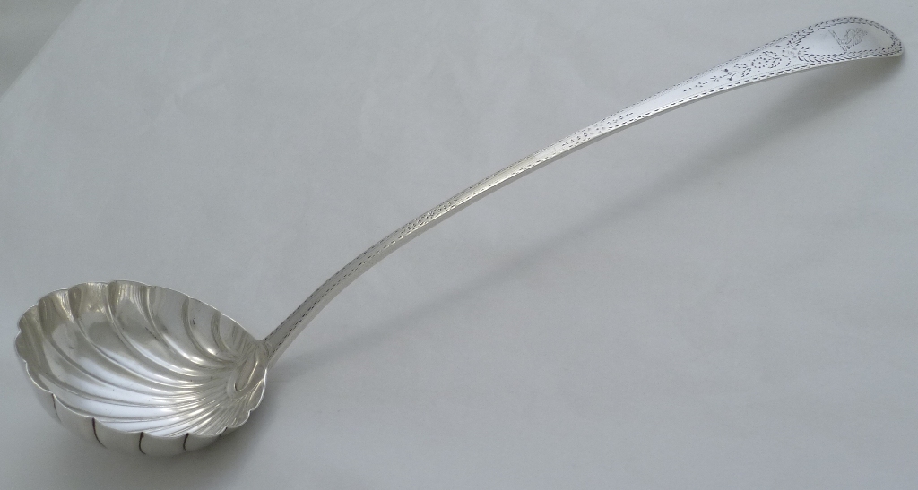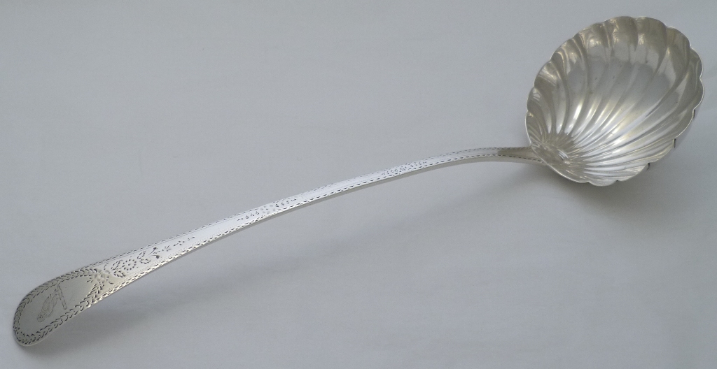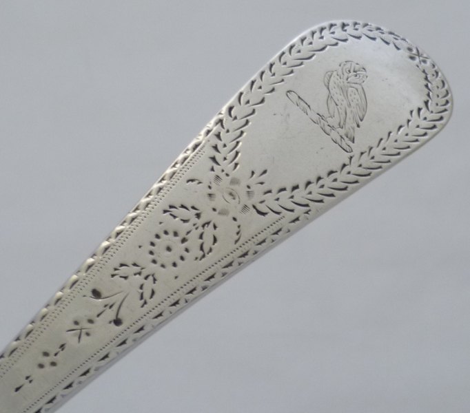 Very good Georgian silver Old English pattern soup ladle with a shell bowl and well preserved bright cut decoration. Clearly struck hallmarks and an oval cartouche engraved with an owl crest. |