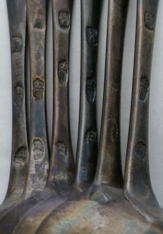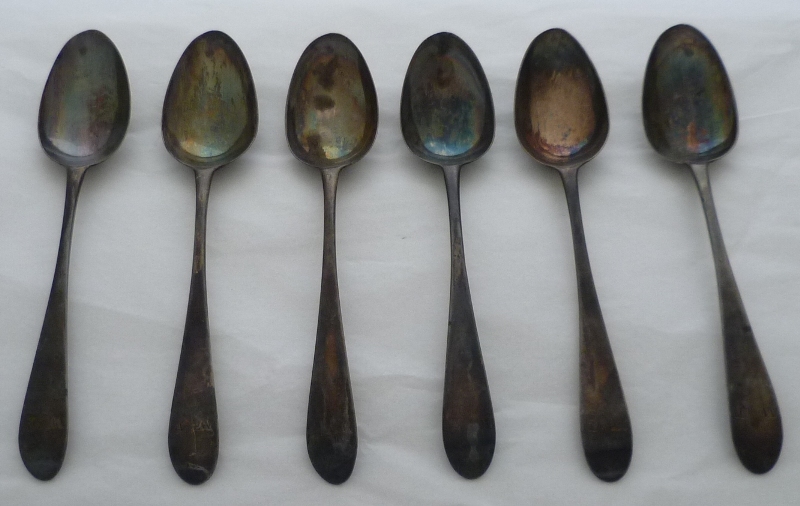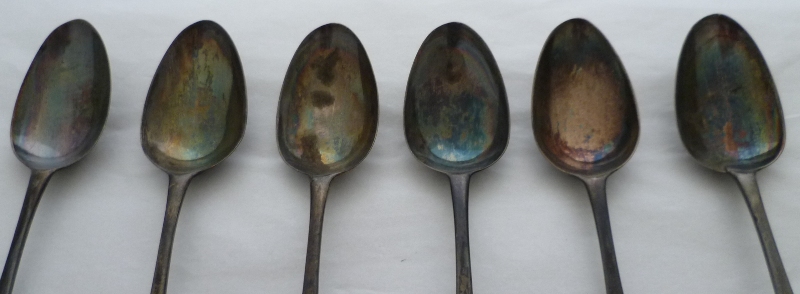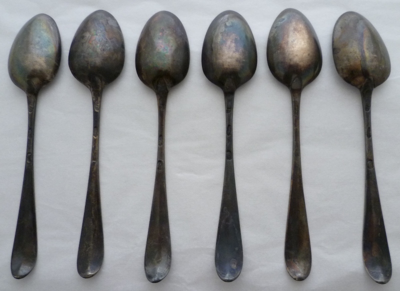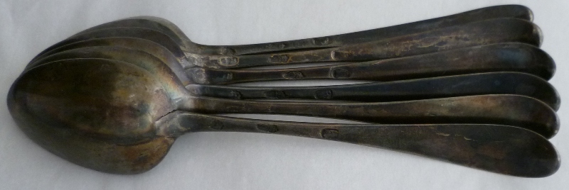 Very lightly used and neglected for the past fifty years at the back of a cupboard, just recently coming to light through inheritance. Not polished but they should clean up fine. Underneath the grime is a surprisingly well preserved set of teaspoons with some little bowl bumps and only slight bowl tip wear to some. |