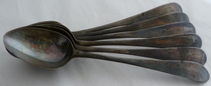 Set of six Irish Georgian silver Pointed Old English pattern teaspoons with original initial engravings to the terminals W * P. |