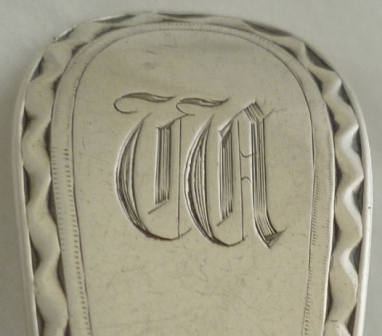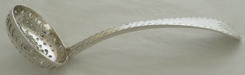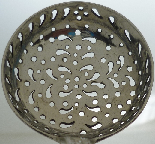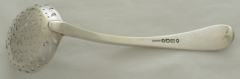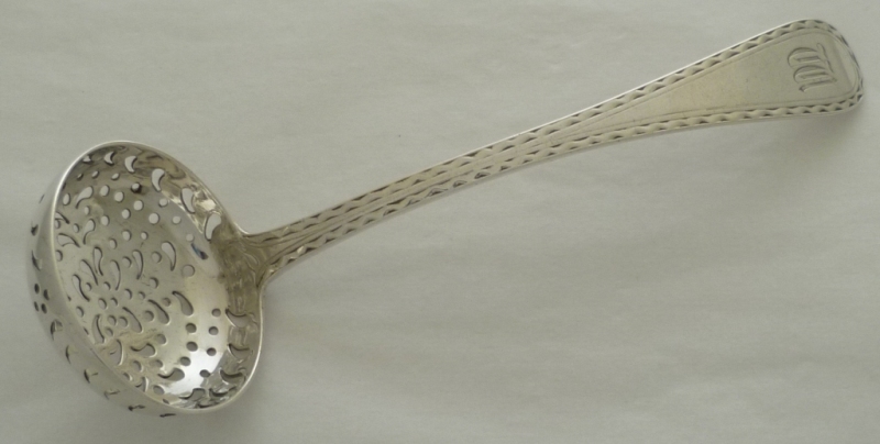Scottish silver Old English pattern sifter ladle, the very thick stem with bright cut engraved edge decoration and a monogram to the terminal. |