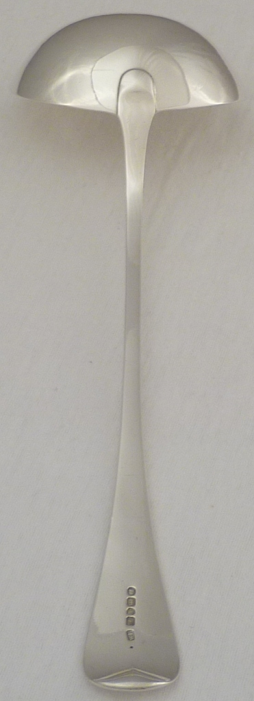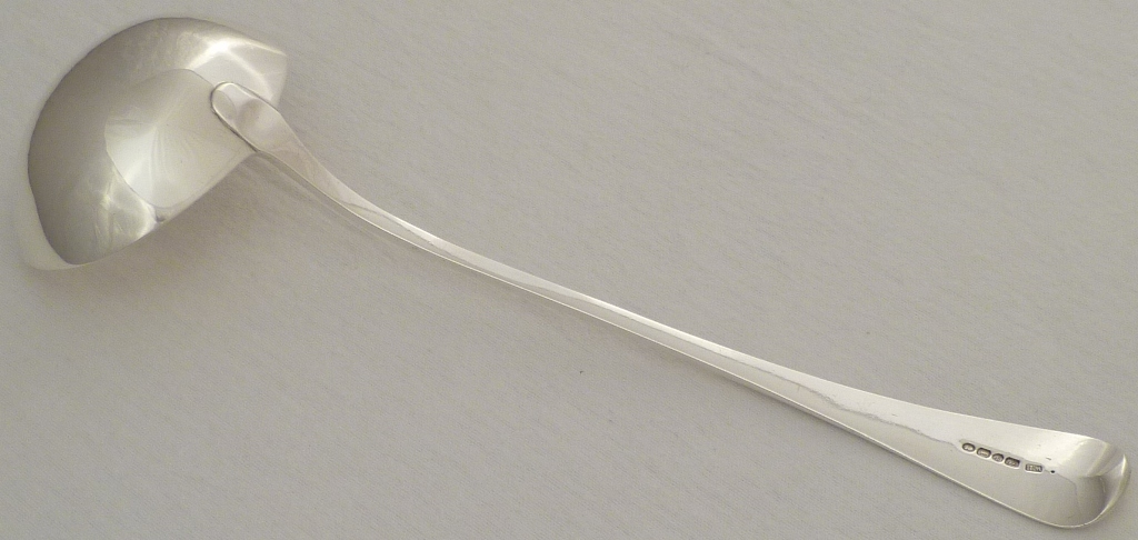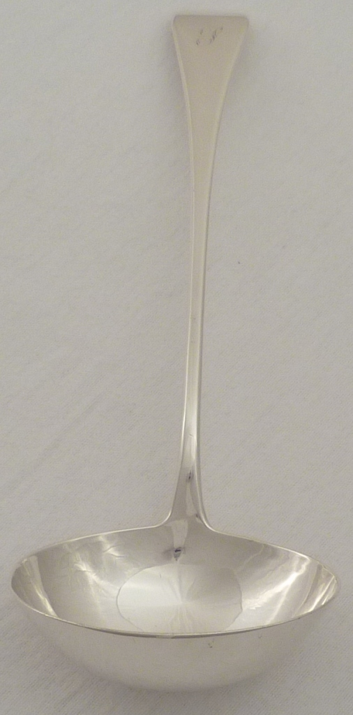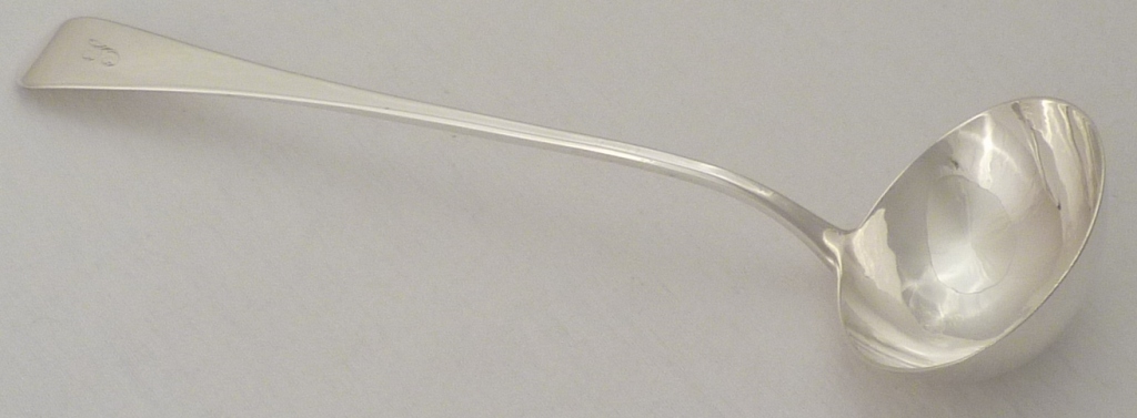 Good, large and heavy Georgian silver Old English pattern soup ladle with a simple initial engraving to the terminal. |