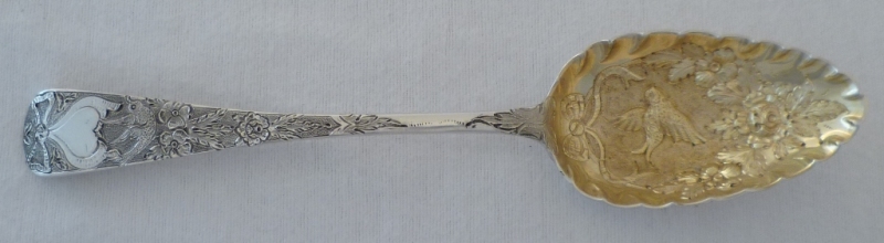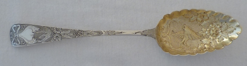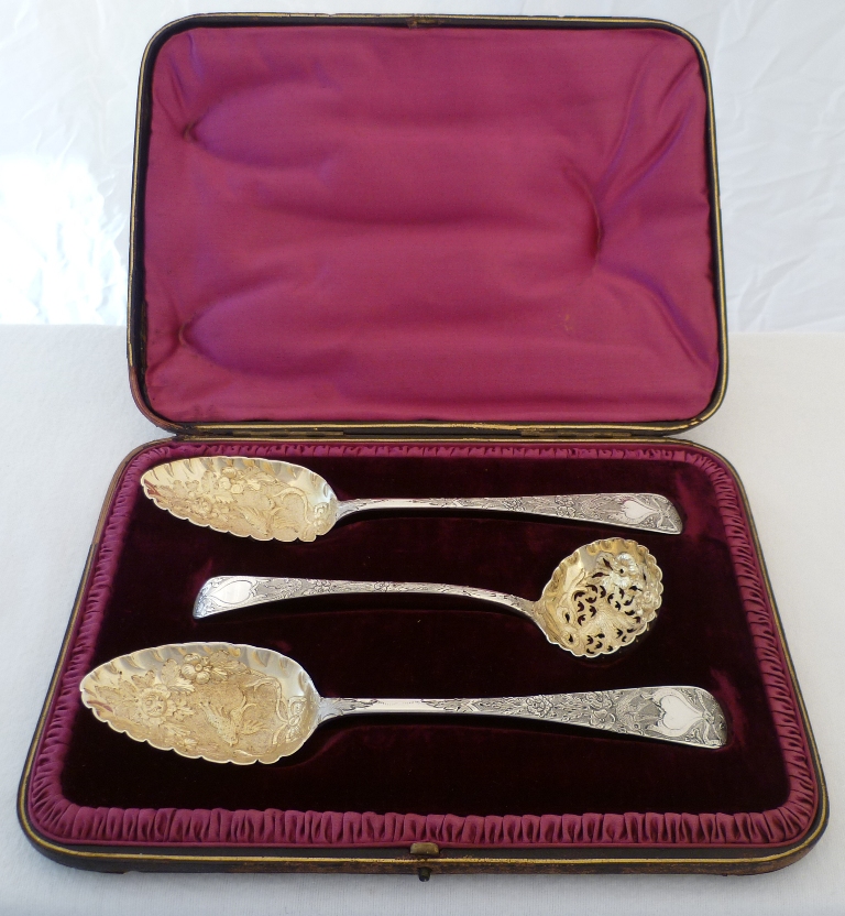 Attractive and cased pair of Georgian silver gilt Old English pattern serving spoons and matching sugar sifter ladle all later gilded and decorated with hearts, ribbon bows, flowers and a love dove to each bowl. Later decoration probably