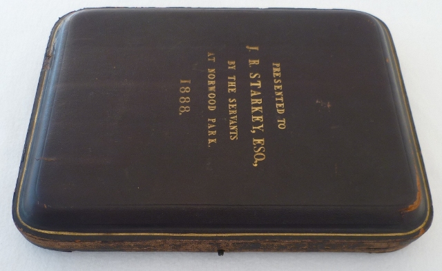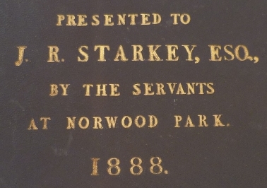 dates from 1888 when the case was made and inscribed "Presented to J. R. Starkey by the servants at Norwood park 1888". The Starkey family have owned Norwood Park since 1881. Sir John R. Starkey founded the fruit farm when he
