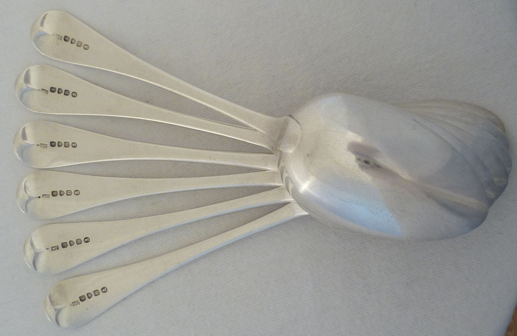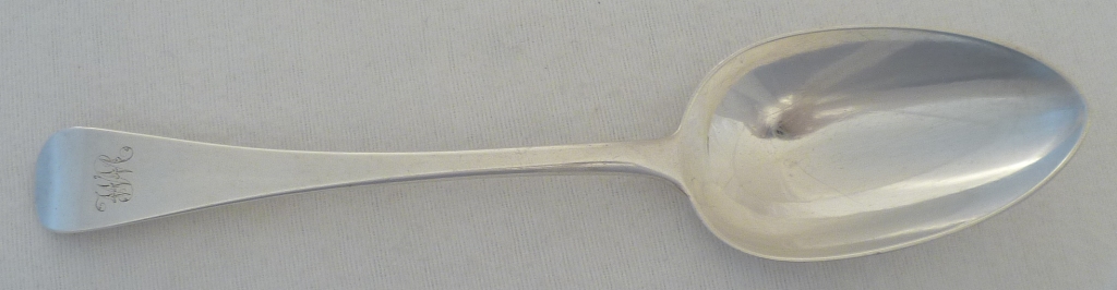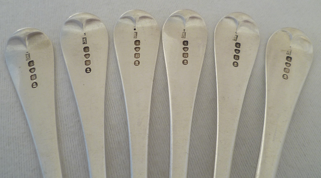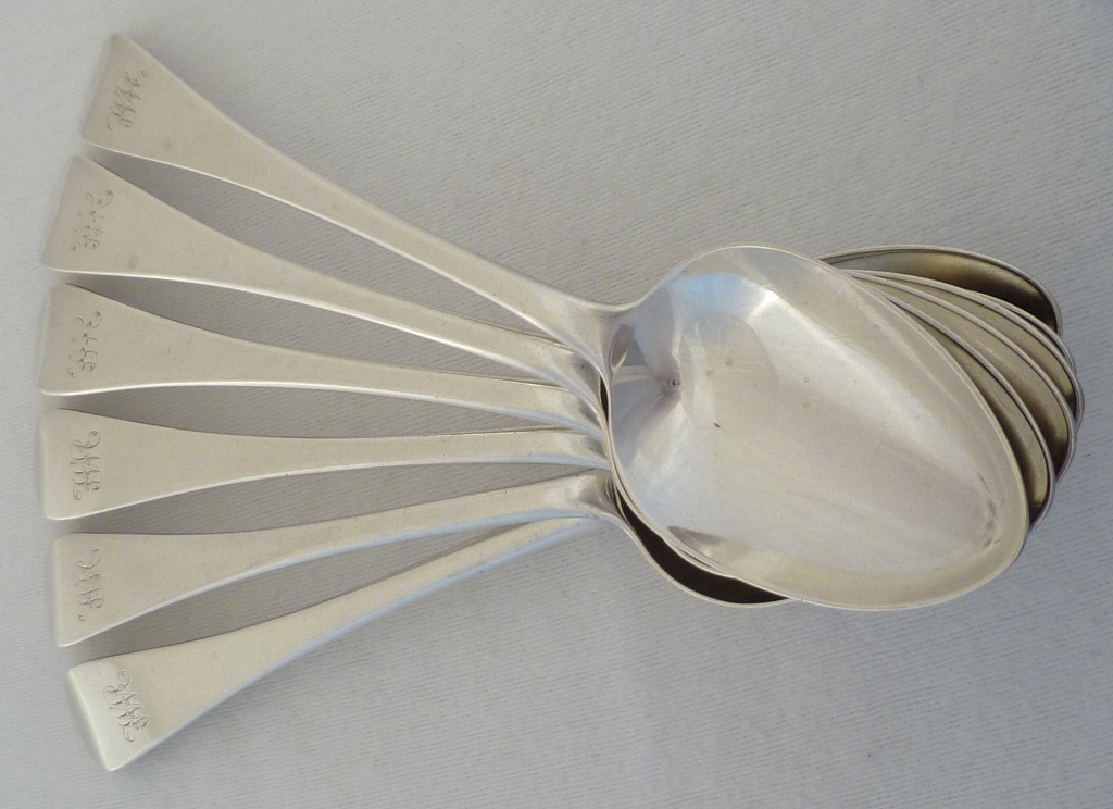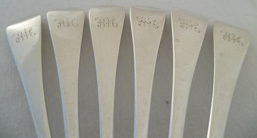 DESCRIPTION | Set of six Georgian silver Old English pattern spoons with the original monogram engraving to the terminals. Perfect match for the smaller spoons m4885. |