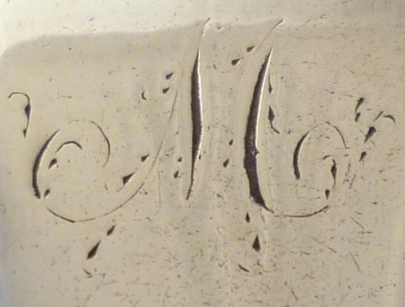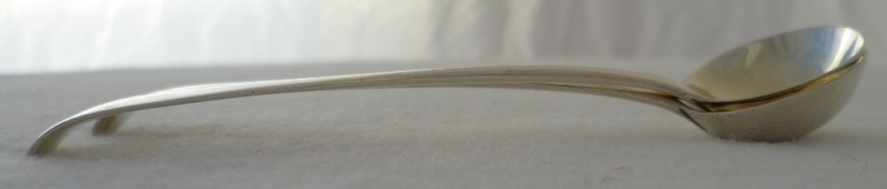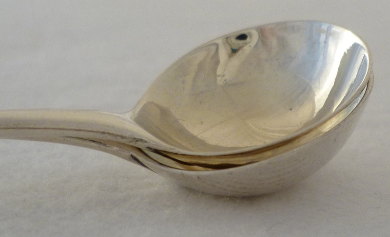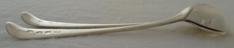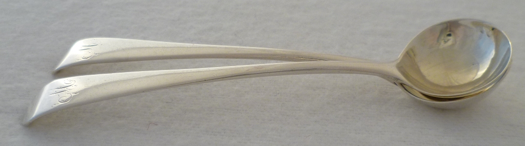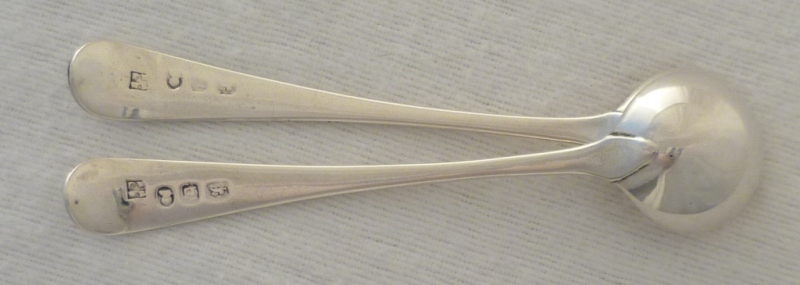 DESCRIPTION | Pair of Georgian silver Old English pattern salt spoons with lightly gilded round bowls and engraved terminals. |