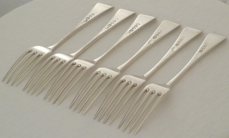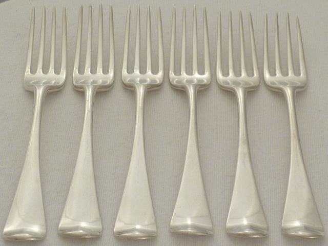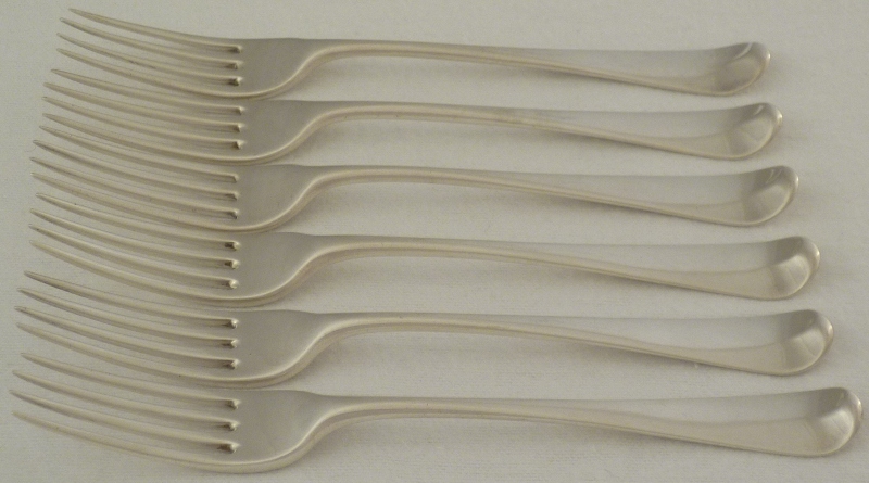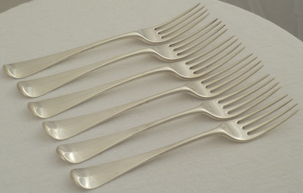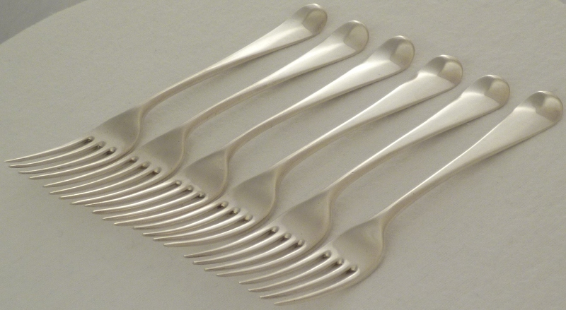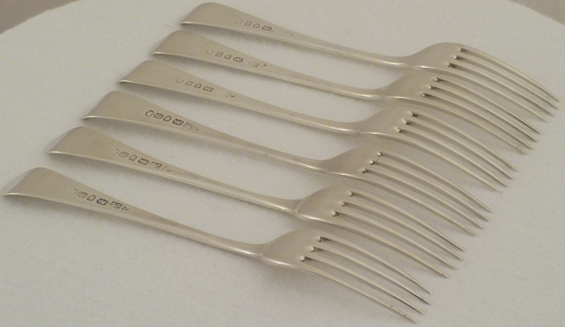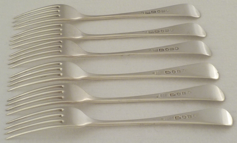 DESCRIPTION | Extremely scarce near set of six Georgian silver Old English pattern four tine dessert forks with no engravings or erasures. |