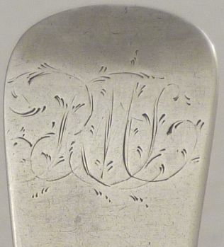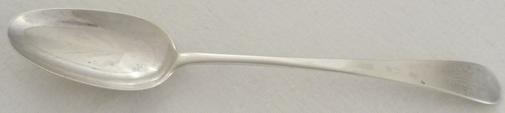 DESCRIPTION | Georgian silver Old English pattern table spoon with a long drop to the bowl back and a monogram engraved terminal. |