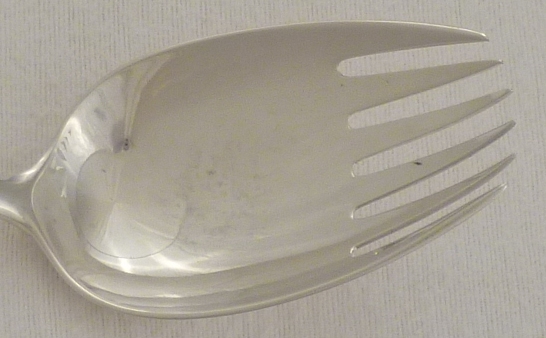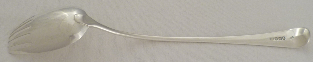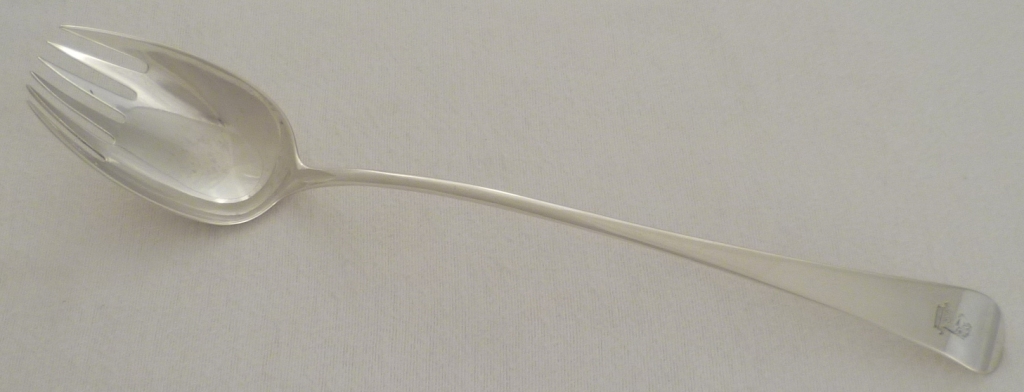 DESCRIPTION | Scarce Georgian silver Old English pattern salad serving fork with a crest engraving. These forks are often found with a large spoon that can be any suitably matching basting spoon. Specific spoons with matching forks for serving salad were not made until much later in the 19th century. |