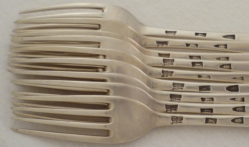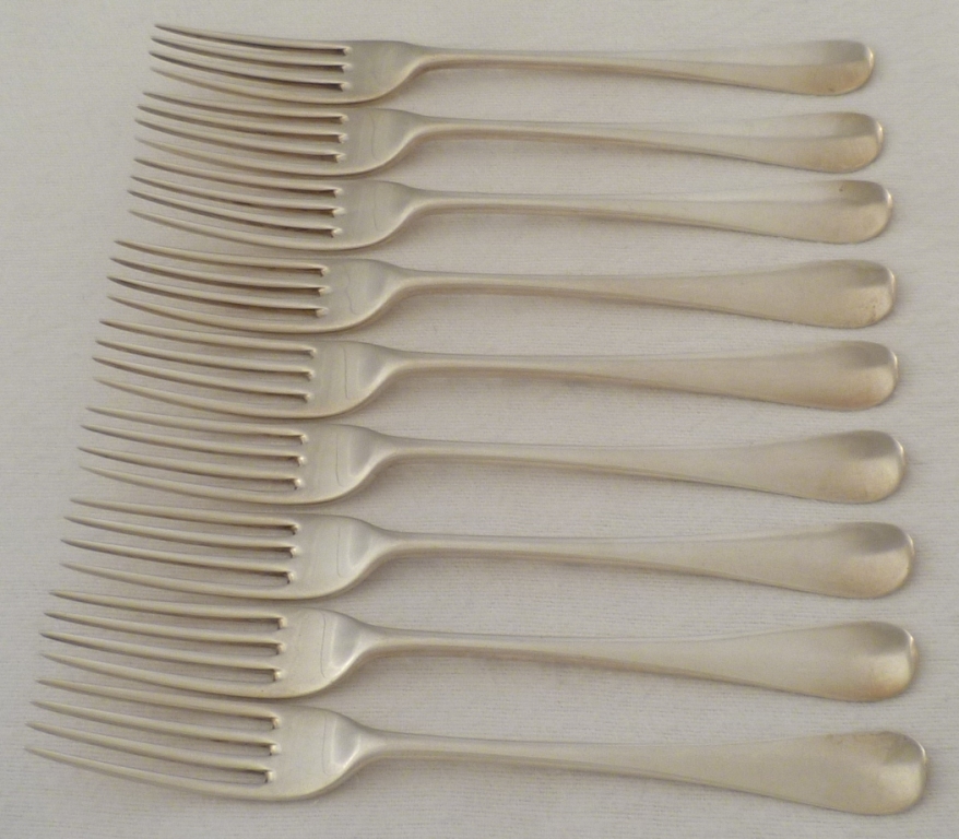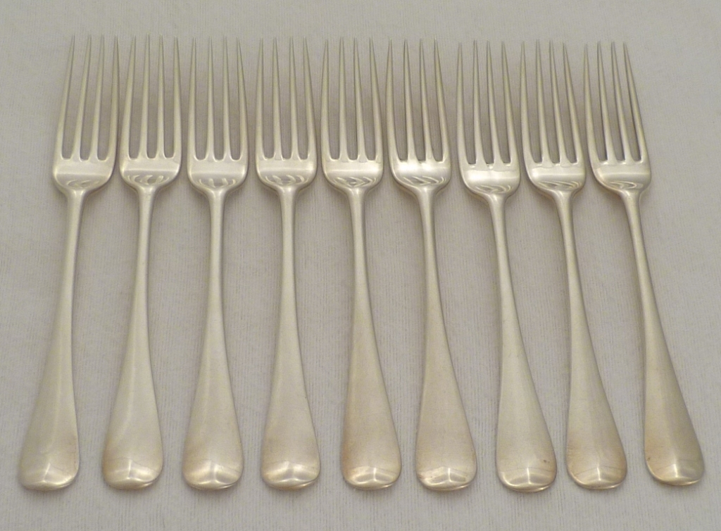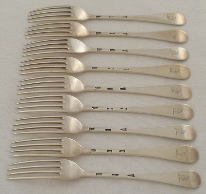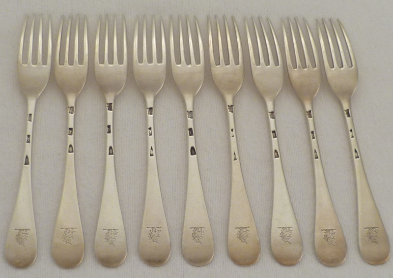Set of nine Georgian silver Old English/Hanoverian pattern four tine dessert forks, crested verso and with beautifully struck hallmarks. Dessert forks are probably the most difficult to find items of an 18th century canteen. Few
