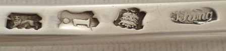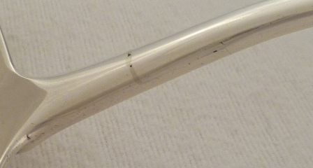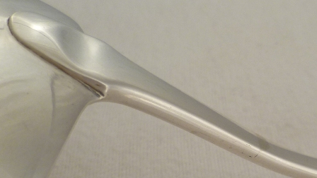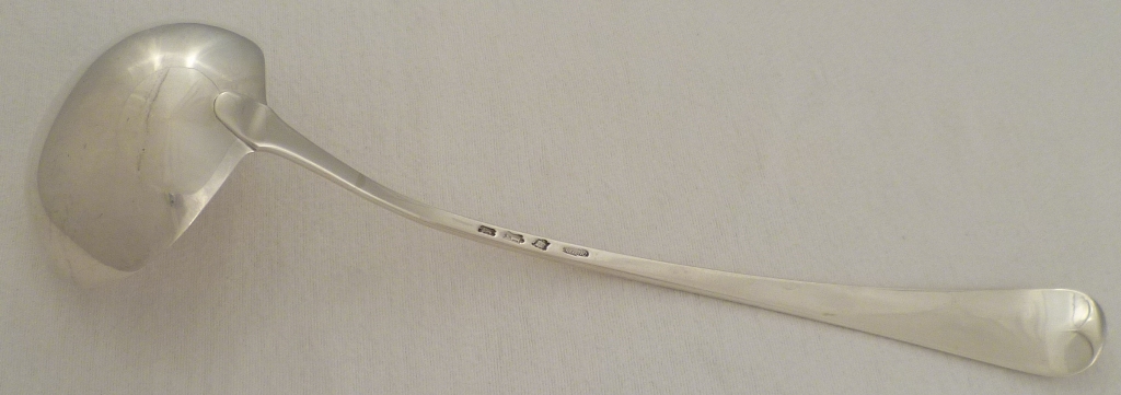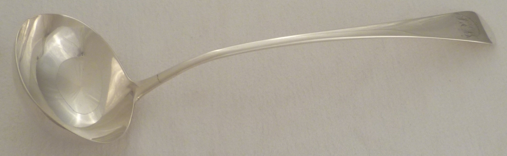 DESCRIPTION | Georgian silver early Old English pattern soup ladle with a scarf joint to the lower stem and a monogram engraving to the terminal. Although early for Old English pattern it is not too early, especially for a serving piece. I can find no evidence of conversion from Hanoverian and the two part construction using a scarf (overlapping) joint together with the wide stem indicates the very earliest of Old English. The hallmarks are well struck and exceptionally clear. |