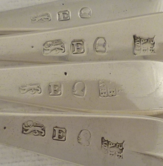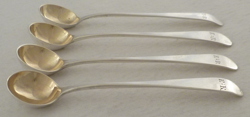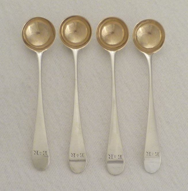DESCRIPTION | Good set of four Georgian silver Old English pattern salt spoons with gilded bowls and initial engraved terminals. |