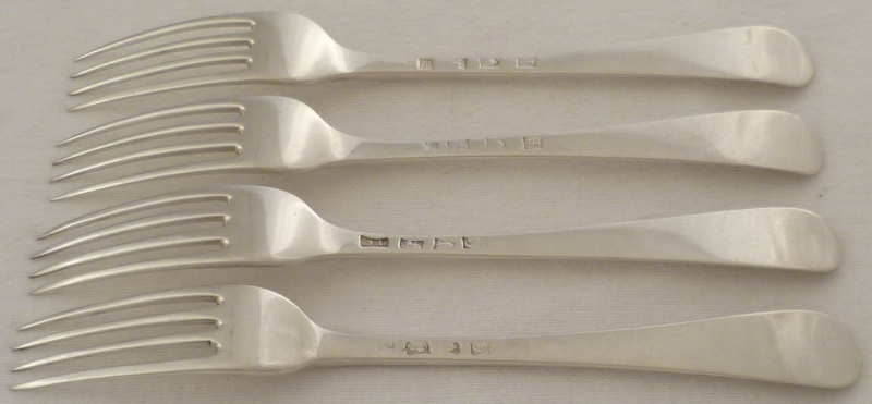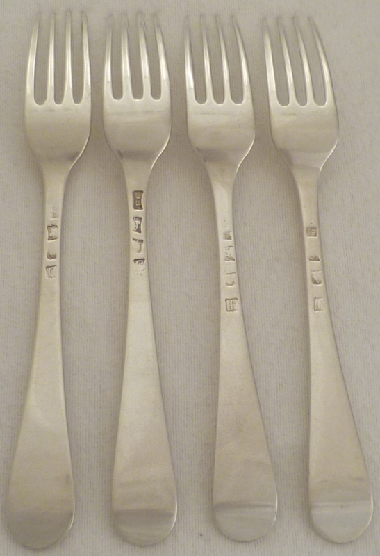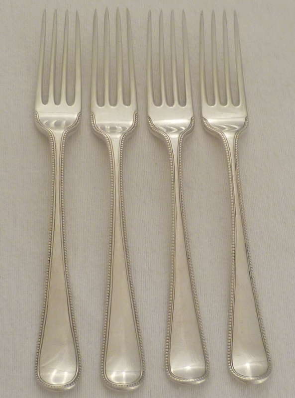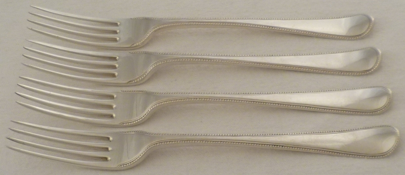 DESCRIPTION | Four Georgian silver bead edge Old English pattern table forks with no engraving or erasure. |