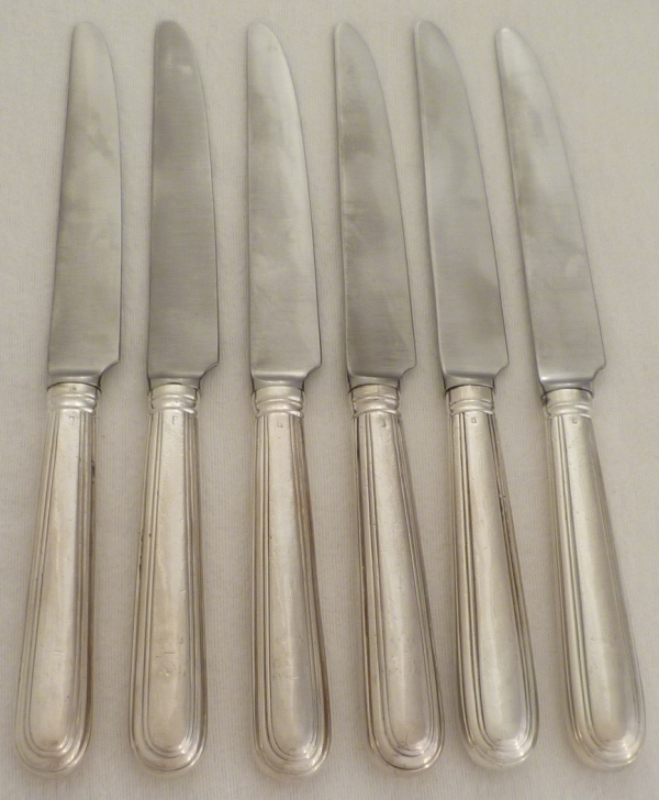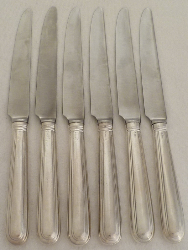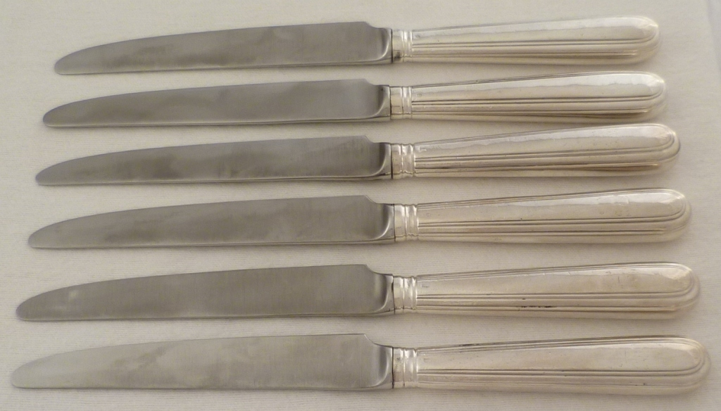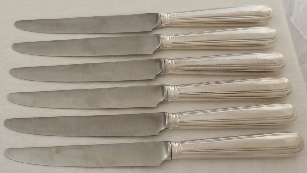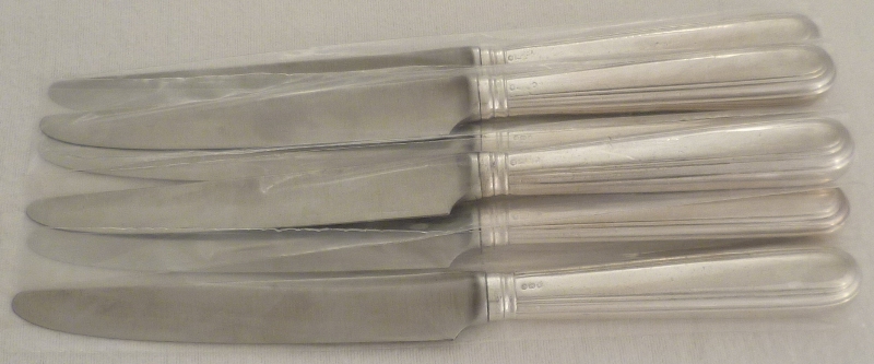 DESCRIPTION | Superb set of six Georgian table knives with pitch loaded silver double struck Old English & Thread pattern handles and new satin finish stainless steel finger point blades. Whilst fitting the new blades my silversmith noted that the silver handles are particularly good and thick. There is a sympathetically light erasure to each that is now to the underside of the handles. The new blades have picked up some patchy colour from the silversmith's polish that will quickly vanish with normal use and washing. |