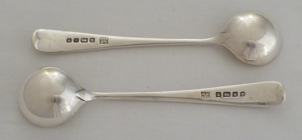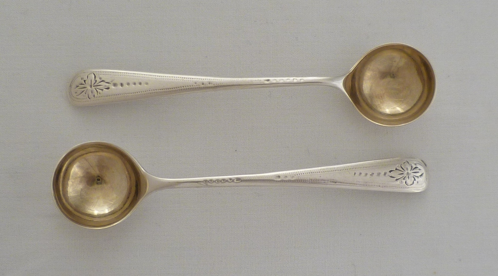 DESCRIPTION | Pair Victorian silver gilt bright cut Old English pattern salt spoons. |