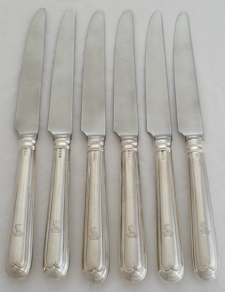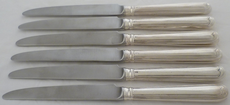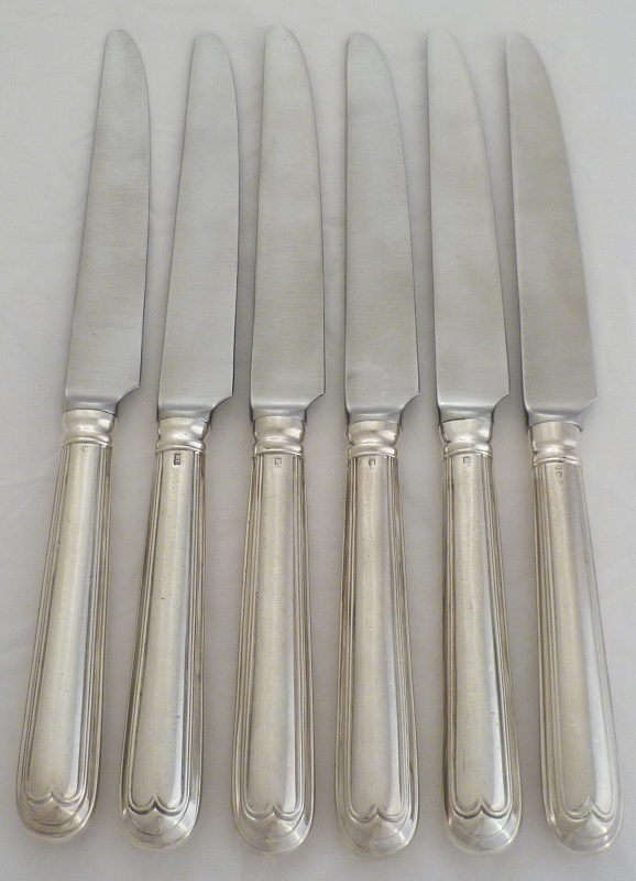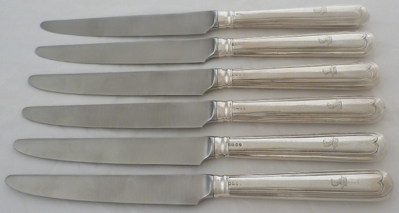 DESCRIPTION | Superb set of six (5 + 1) Georgian table knives with pitch loaded silver double struck Old English & Thread pattern handles, crested to the upper side and fitted with new satin finish stainless steel finger point blades. |