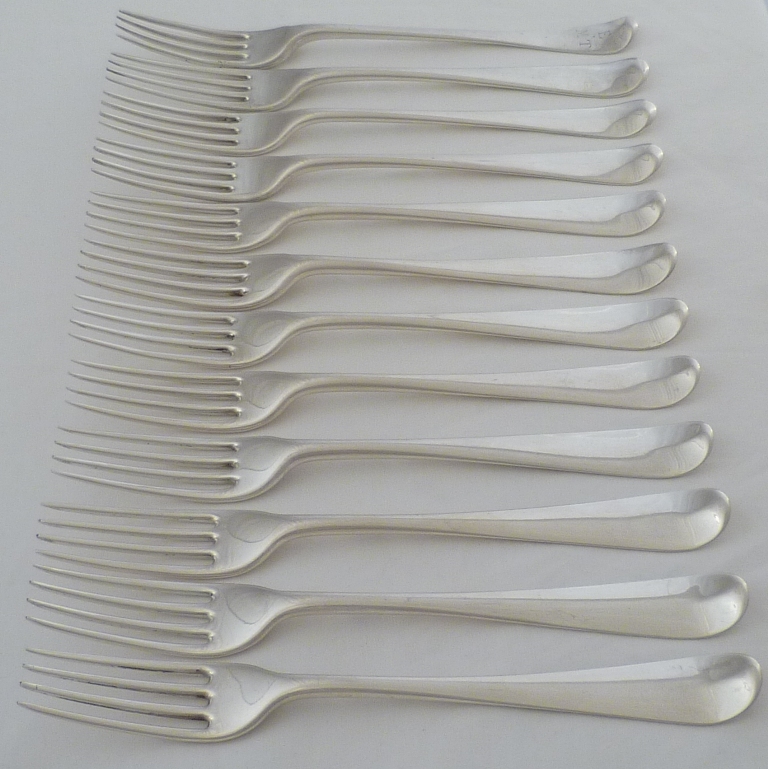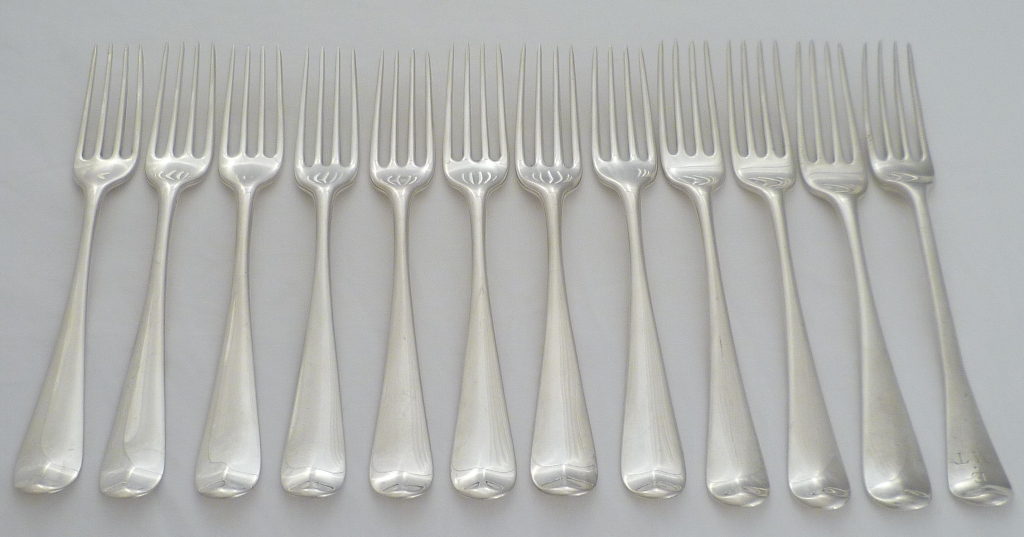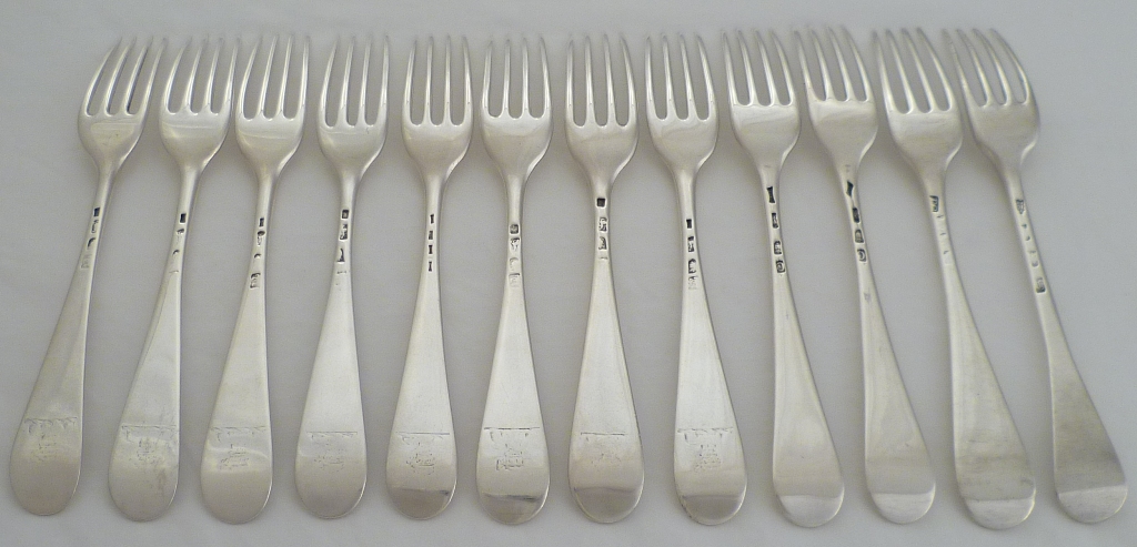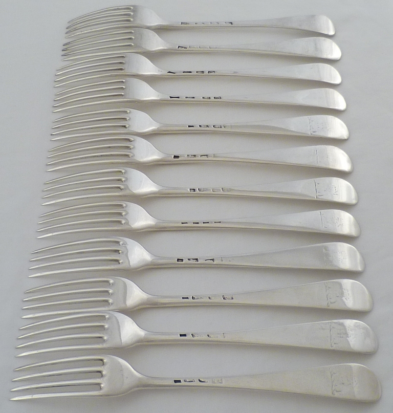 A matched set of twelve Georgian silver Old English pattern table forks. The eight Sumner & Crossley examples have a rubbed crest engraving verso, three have no engravings and the 1758 Callard example has an initial engraving to