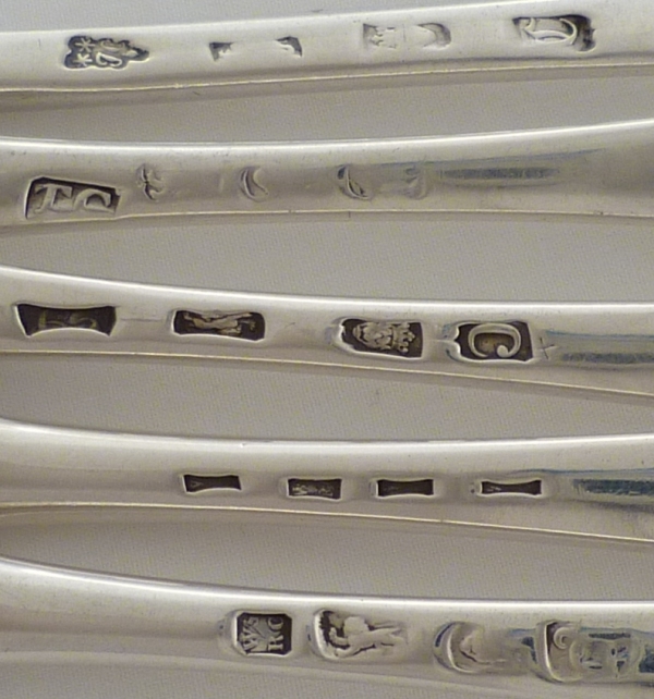 8 x 1775, 2 x 1778, 1 x 1758, 1 x circa 1775. One of the WS.RC examples is a duty dodger and marked four times with makers mark only and the TC date letter is rubbed but circa 1775. |