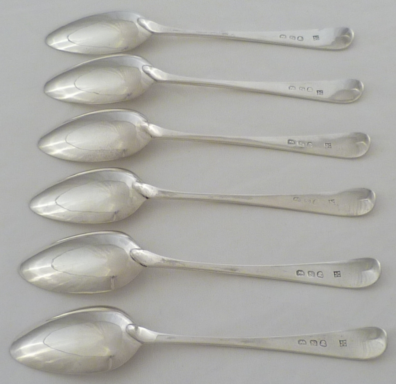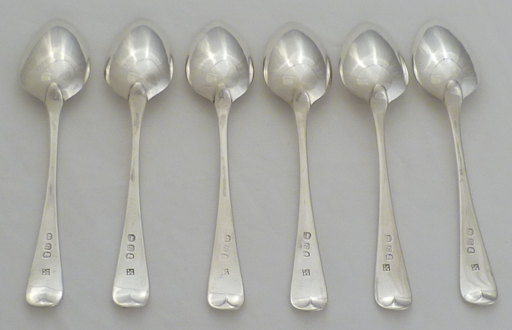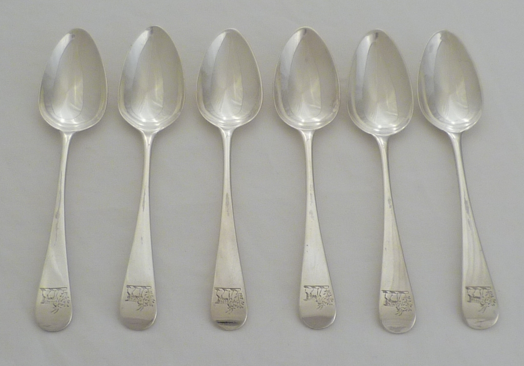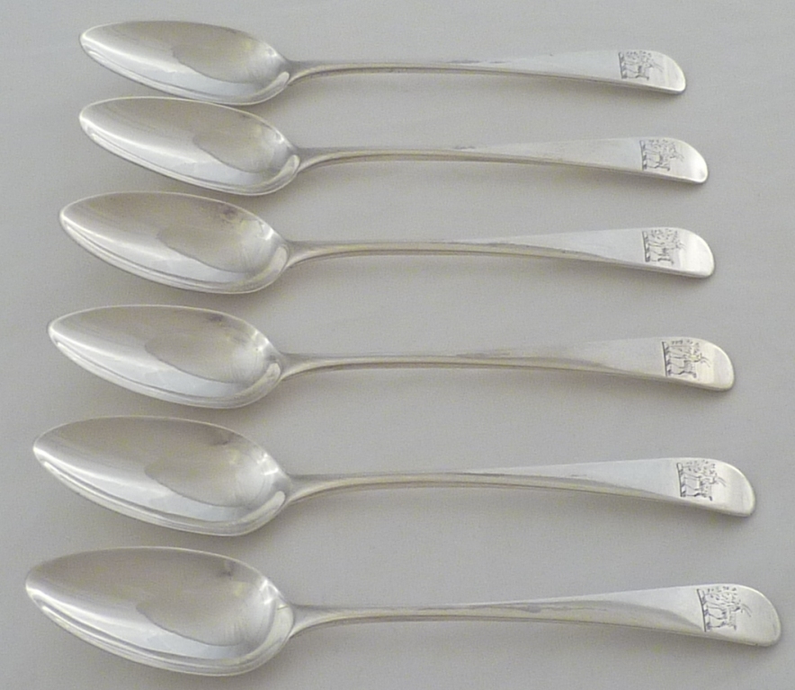 DESCRIPTION | Good set of six Georgian silver Old English pattern teaspoons with a nice frontal crest engraving. |