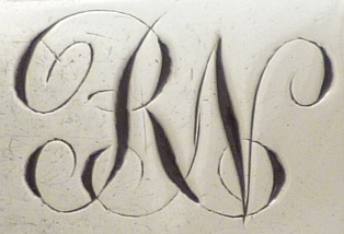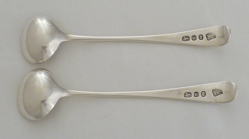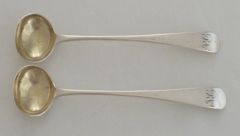 DESCRIPTION | Pair of Georgian silver Old English pattern salt spoons with gilded bowls and frontal monogram engraving. |
