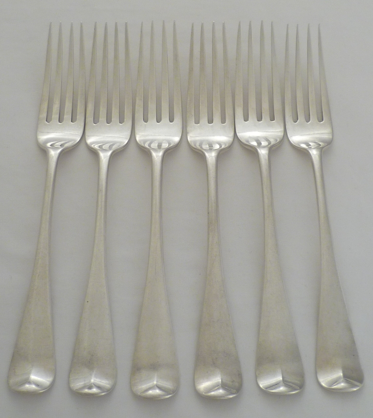 DESCRIPTION | Good set of six Georgian silver Old English pattern table forks with a monogram engraving verso. |