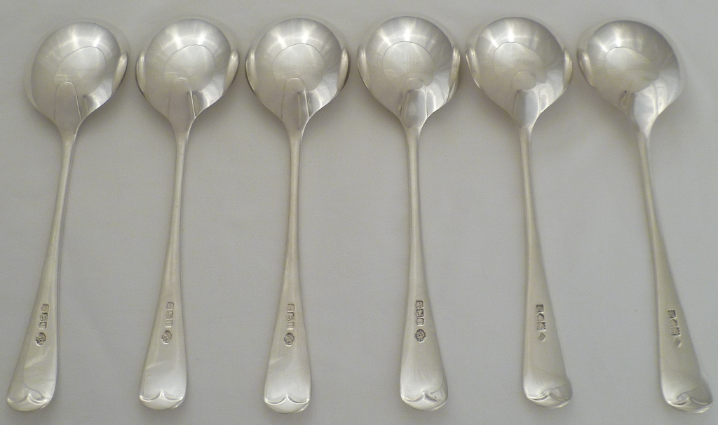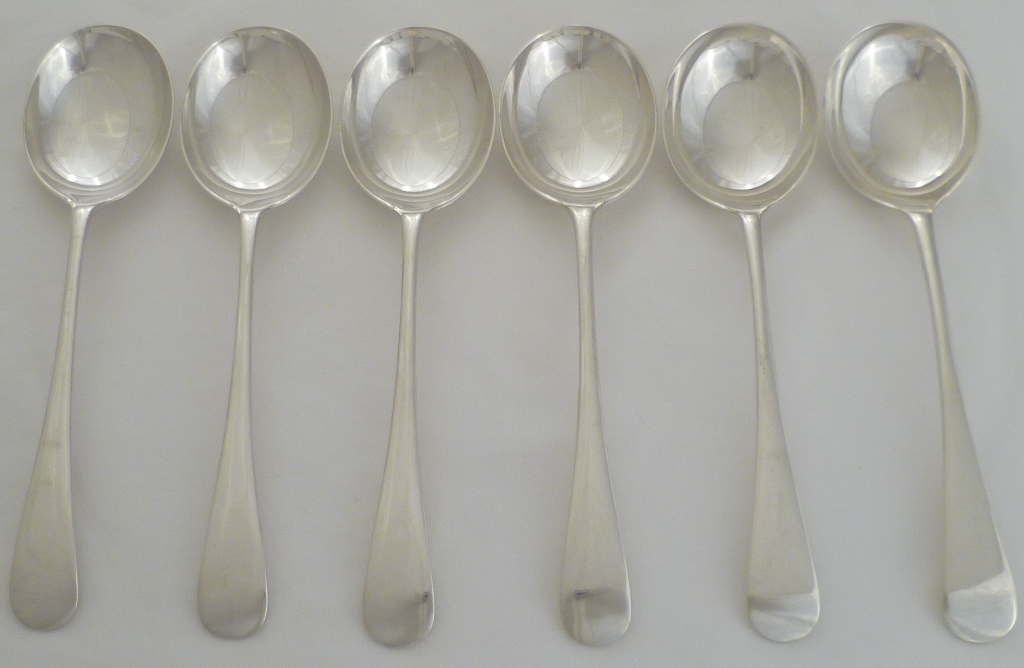 DESCRIPTION | Six good quality silver Old English pattern round bowled soup spoons with no engraving or erasure. |