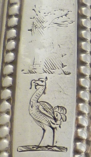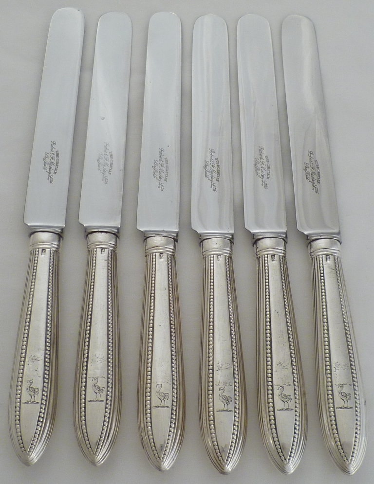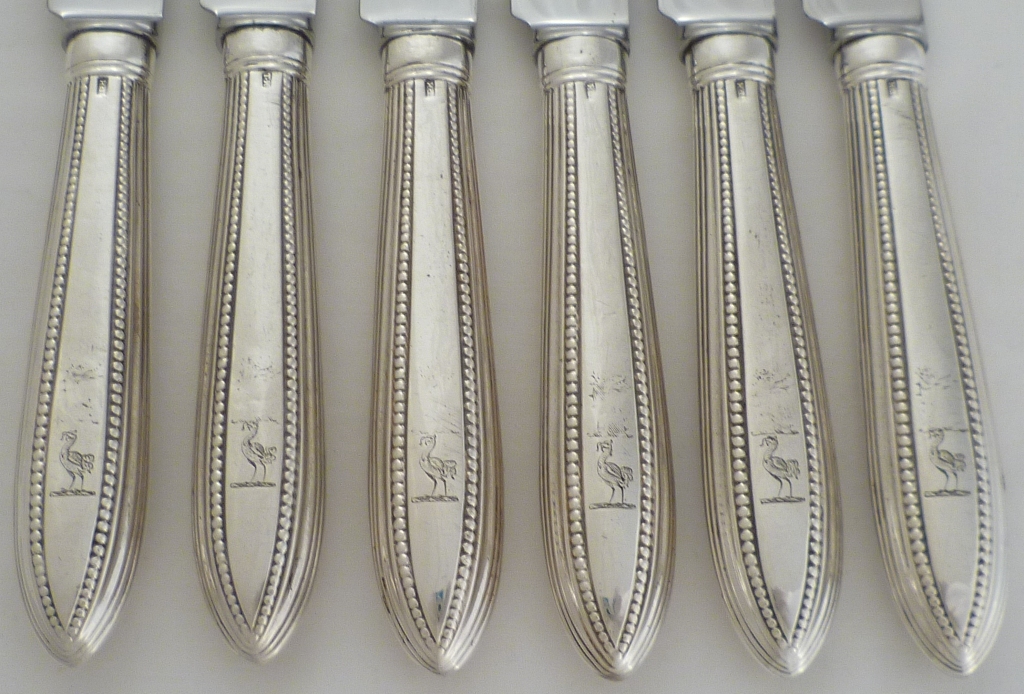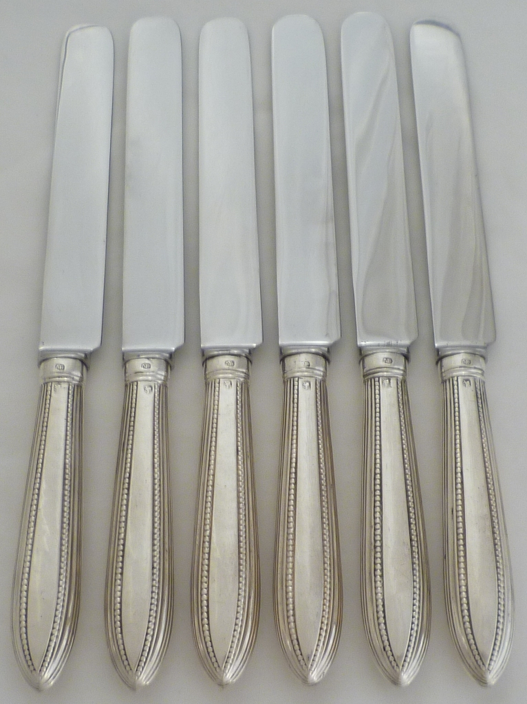 DESCRIPTION | Superb set of six Georgian silver Bead Edge Pointed Old English & Thread pattern table knives with pitch loaded silver handles and 20th century mirror polished stainless steel blades. Crest engraving to one side below an earlier and partially erased crest engraving. I suspect the old silversmith wanted to erase the early crest without overly thinning the metal. I have had the pitch loading replaced so these knives should be good for another two hundred years although they should not be immersed in hot water or cleaned in a dishwasher. |