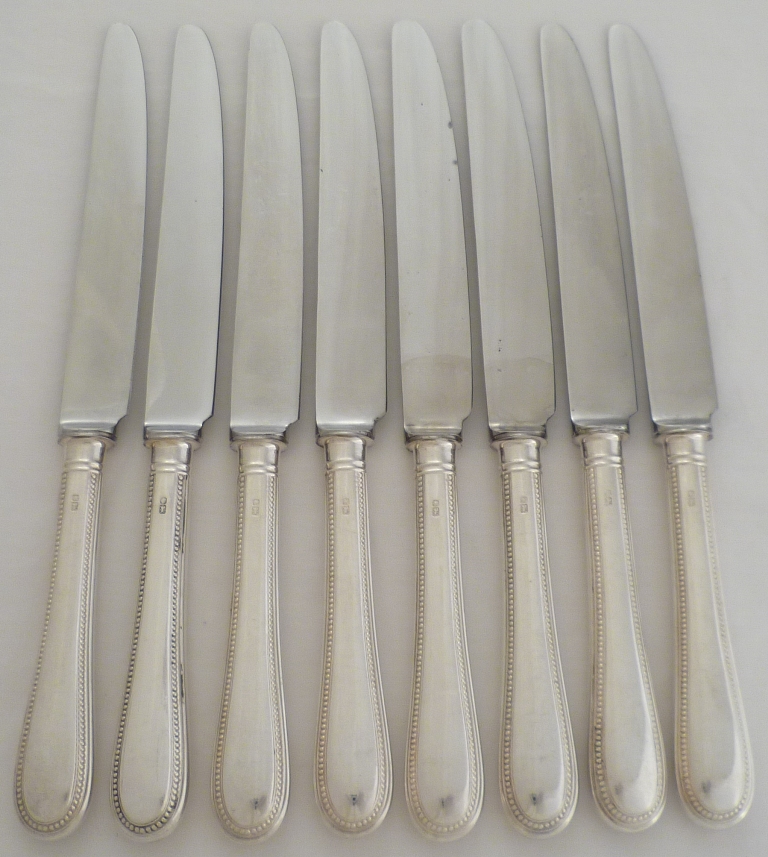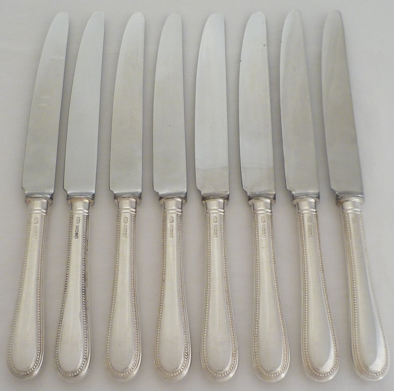 DESCRIPTION | Set of eight bead edged round end Old English pattern table knives with loaded silver handles and stainless steel blades. These knives have soldered joints so can be cleaned in a dishwasher. |