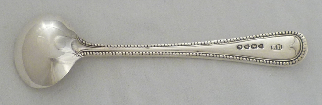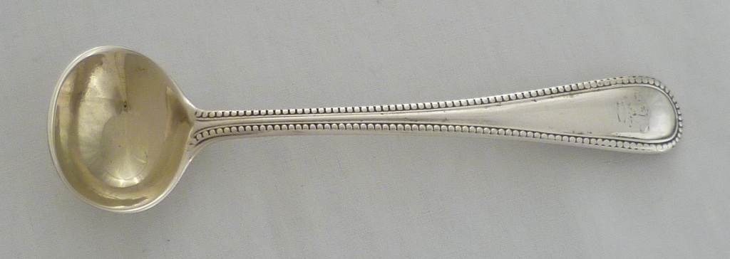 DESCRIPTION | Good Victorian silver double struck bead edged Old English pattern salt spoon with a gilded bowl and frontal crest engraving. |