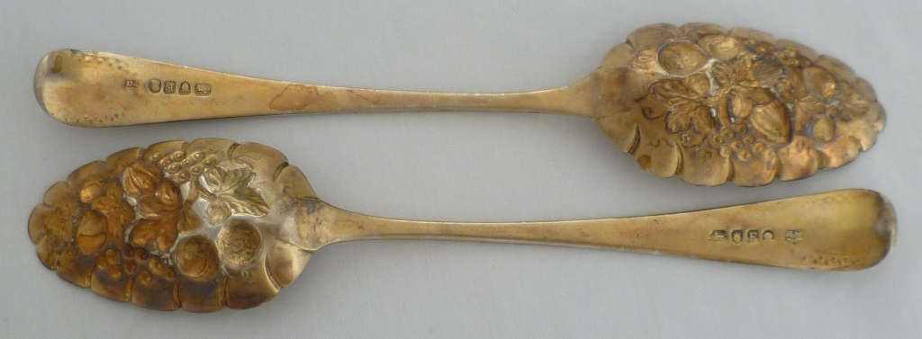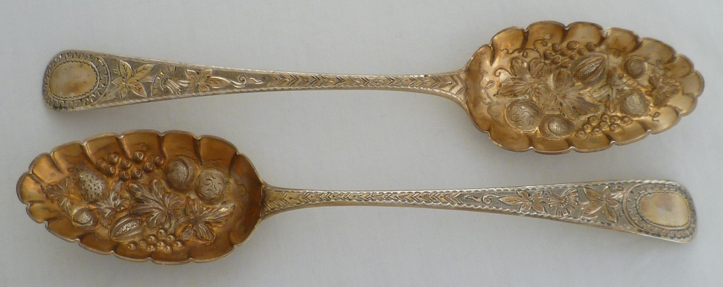DESCRIPTION | Good pair of Georgian silver gilt Old English pattern 'berry spoons' with later gilding, embossed and engraved decoration. |