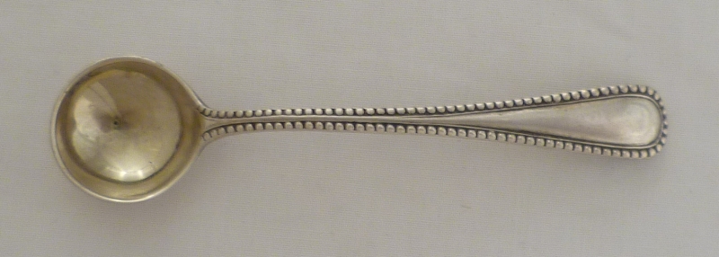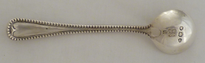 DESCRIPTION | Victorian silver bead edged Old English pattern salt spoon with a gilded bowl and no engraving or erasure. |