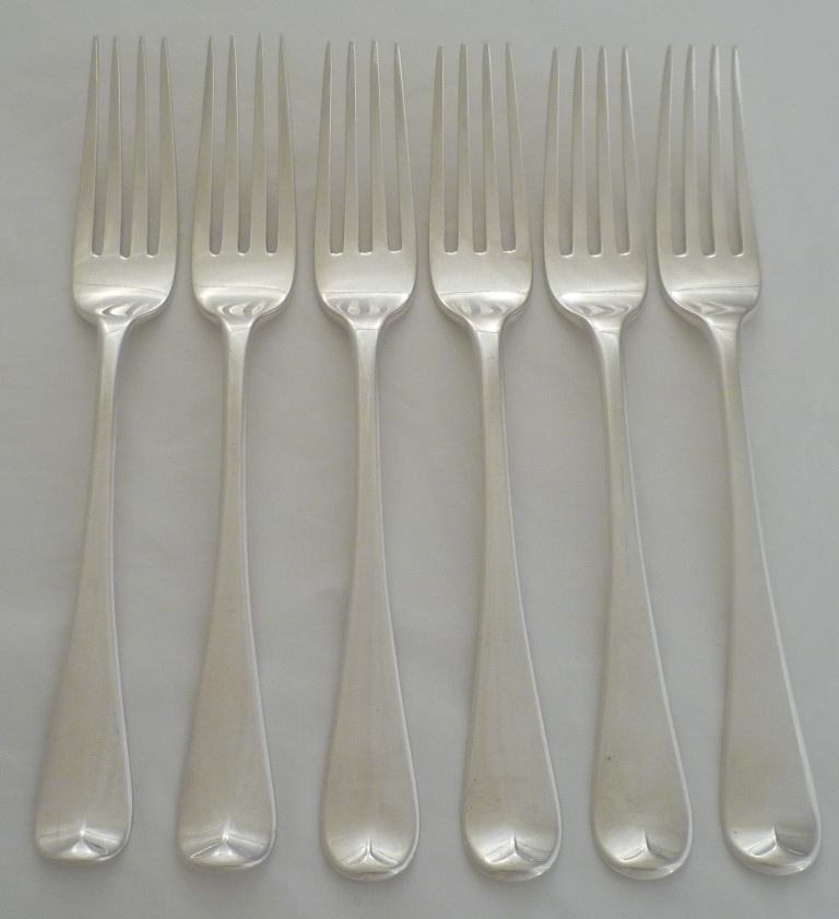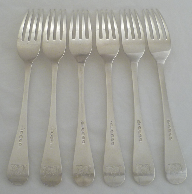 DESCRIPTION | Set of six Georgian silver Old English pattern table forks with a crest engraving verso. |