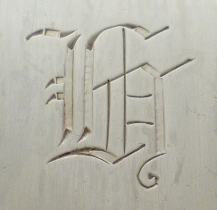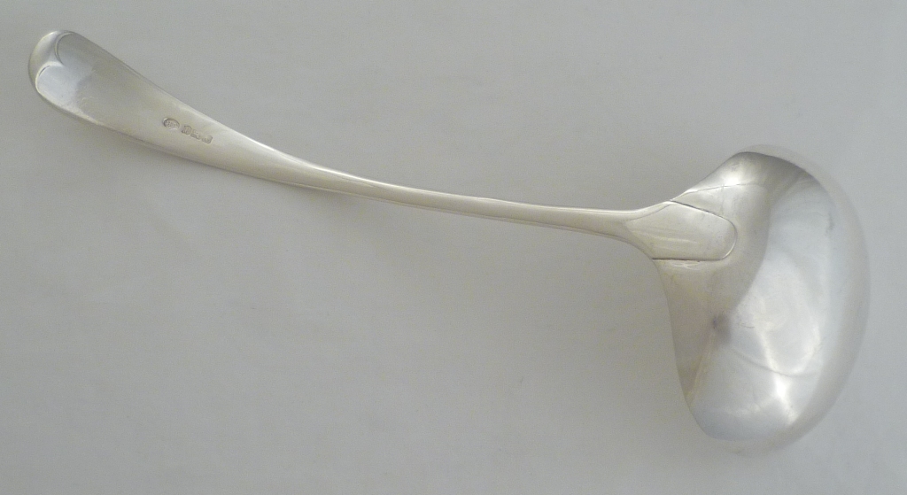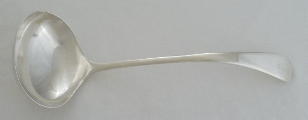 DESCRIPTION | Silver Old English pattern soup ladle with a frontal initial engraving. |