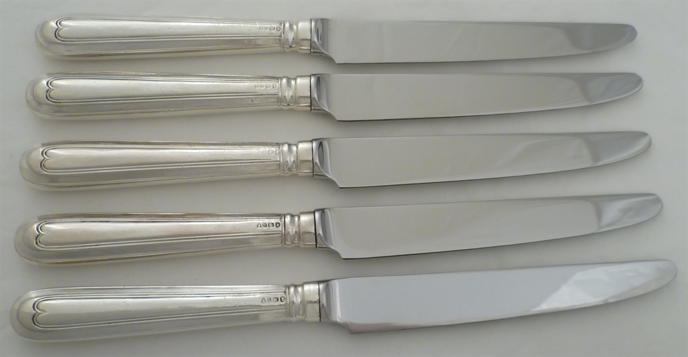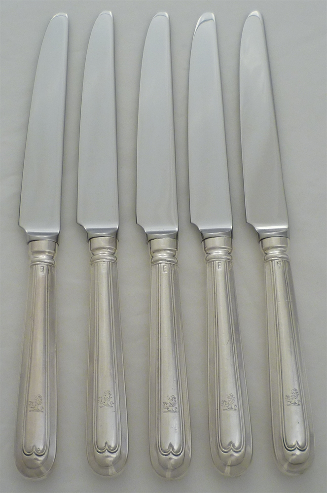 DESCRIPTION | Superb set of five Georgian silver Old English & Thread pattern table knives with a crest engraving to one side and good, clear hallmarks throughout. I have just fitted new mirror finished taper edged stainless steel blades. Traditional pitch loading to the handles so should not be cleaned in a dishwasher. |